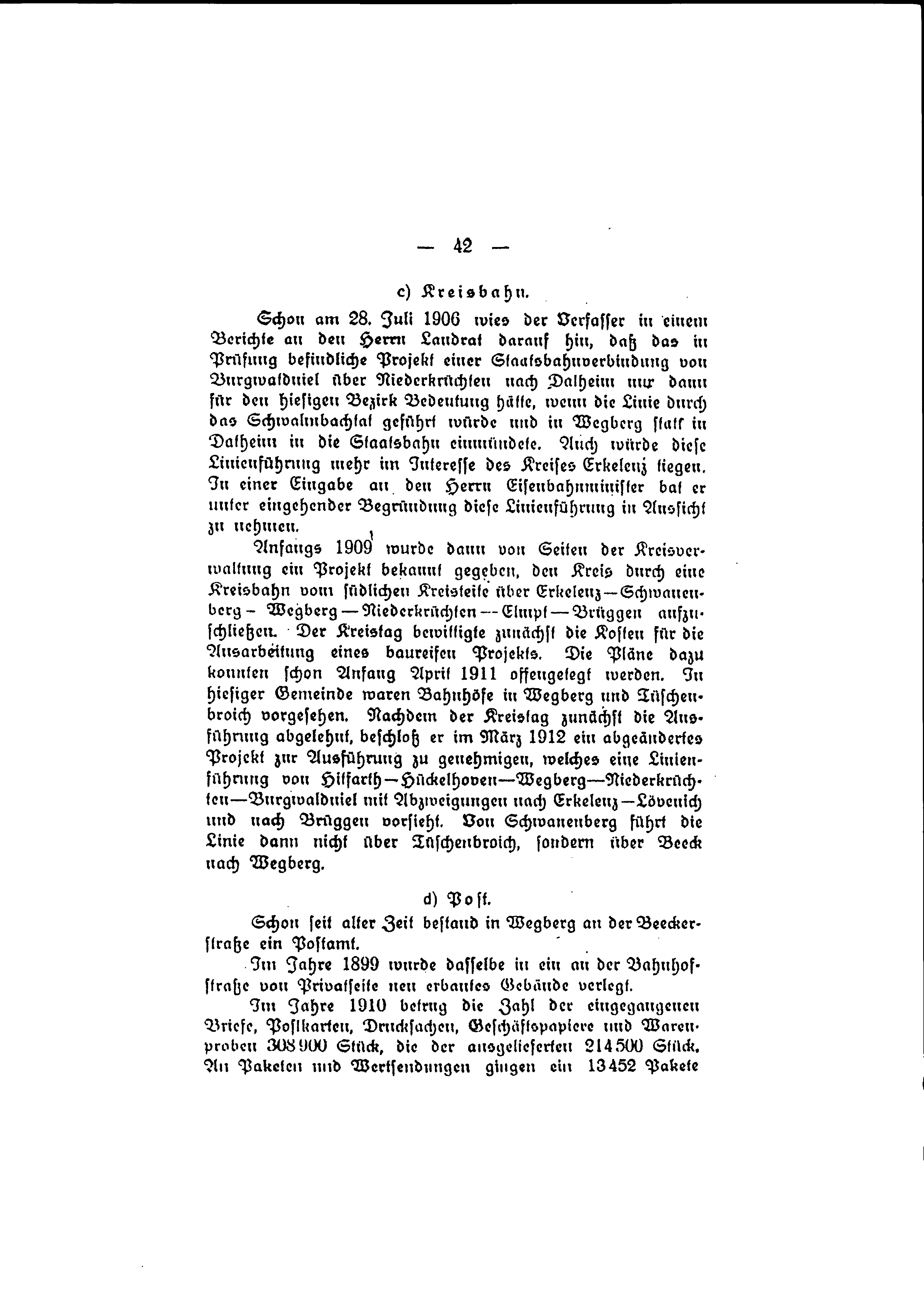 {{NE}}Schon am 28. Juli 1906 wies der Verfasser in einem Berichte an den Herrn Landrat darauf hin, daß das in Prüfung befindliche Projekt einer Staatsbahnverbindung von Burgwaldniel über Niederkrüchten nach Dalheim nur dann für den hiesigen Bezirk Bedeutung hätte, wenn die Linie durch das Schwalmbachtal geführt würde und in Wegberg statt in Dalheim in die Staatsbahn einmündete. Auch würde diese Linienführung mehr im Interesse des Kreises Erkelenz liegen. In einer Eingabe an den Herrn Eisenbahnminister bat er unter eingehender Begründung diese Linienführung in Aussicht zu nehmen. | |||