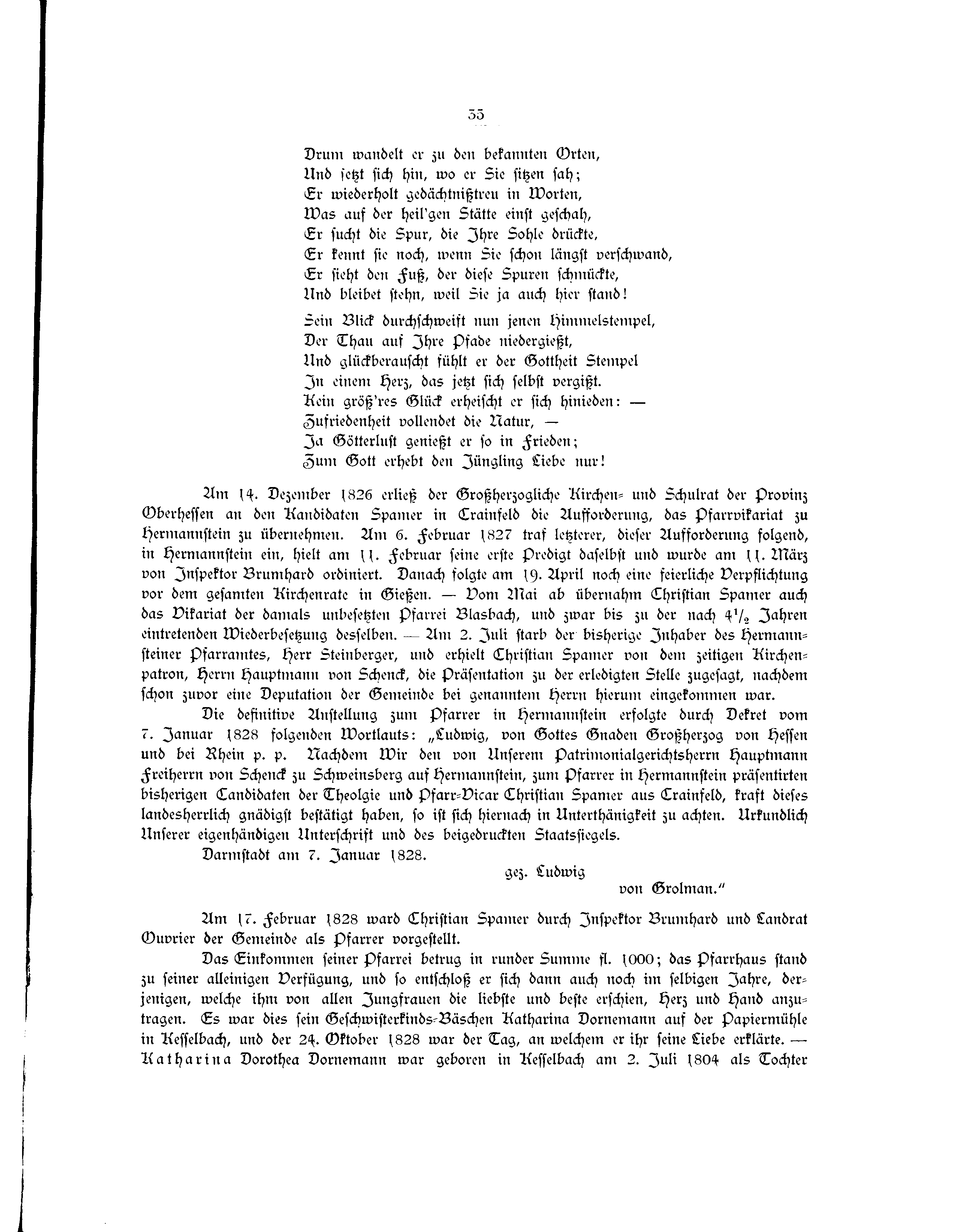 Die definitive Anstellung zum Pfarrer in Hermannstein erfolgte durch Dekret vom 7. Januar 1828 folgenden Wortlauts: „Ludwig, von Gottes Gnaden Großherzog von Hessen und bei Rhein p. p. Nachdem Wir den von Unserem Patrimonialgerichtsherrn Hauptmann Freiherrn von Schenck zu Schweinsberg auf Hermannstein, zum Pfarrer in Hermannstein präsentirten bisherigen Candidaten der Theolgie und Pfarr-Vicar Christian Spamer aus Crainfeld, kraft dieses landesherrlich gnädigst bestätigt haben, so ist sich hiernach in Unterthänigkeit zu achten. Urkundlich Unserer eigenhändigen Unterschrift und des beigedruckten Staatssiegels. | |||