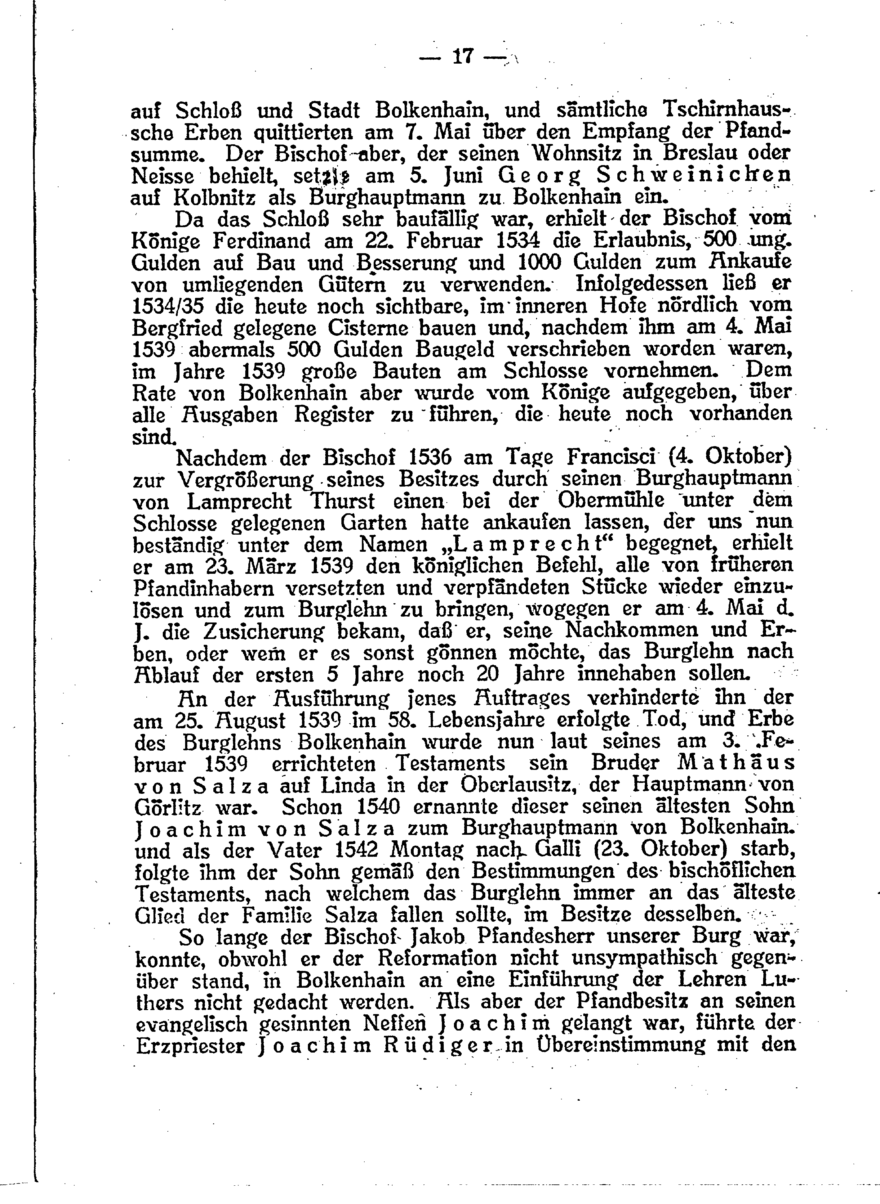 An der Ausführung jenes Auftrages verhinderte ihn der am 25. August 1539 im 58. Lebensjahre erfolgte Tod, und Erbe des Burglehns Bolkenhain wurde nun laut seines am 3. Februar 1539 errichteten Testaments sein Bruder Mathäus von Salza auf Linda in der Oberlausitz, der Hauptmann von Görlitz war. Schon 1540 ernannte dieser seinen ältesten Sohn Joachim von Salza zum Burghauptmann von Bolkenhain und als der Vater 1542 Montag nach Galli (23. Oktober) starb, folgte ihm der Sohn gemäß den Bestimmungen des bischöflichen Testaments, nach welchem das Burglehn immer an das älteste Glied der Familie Salza fallen sollte, im Besitze desselben.