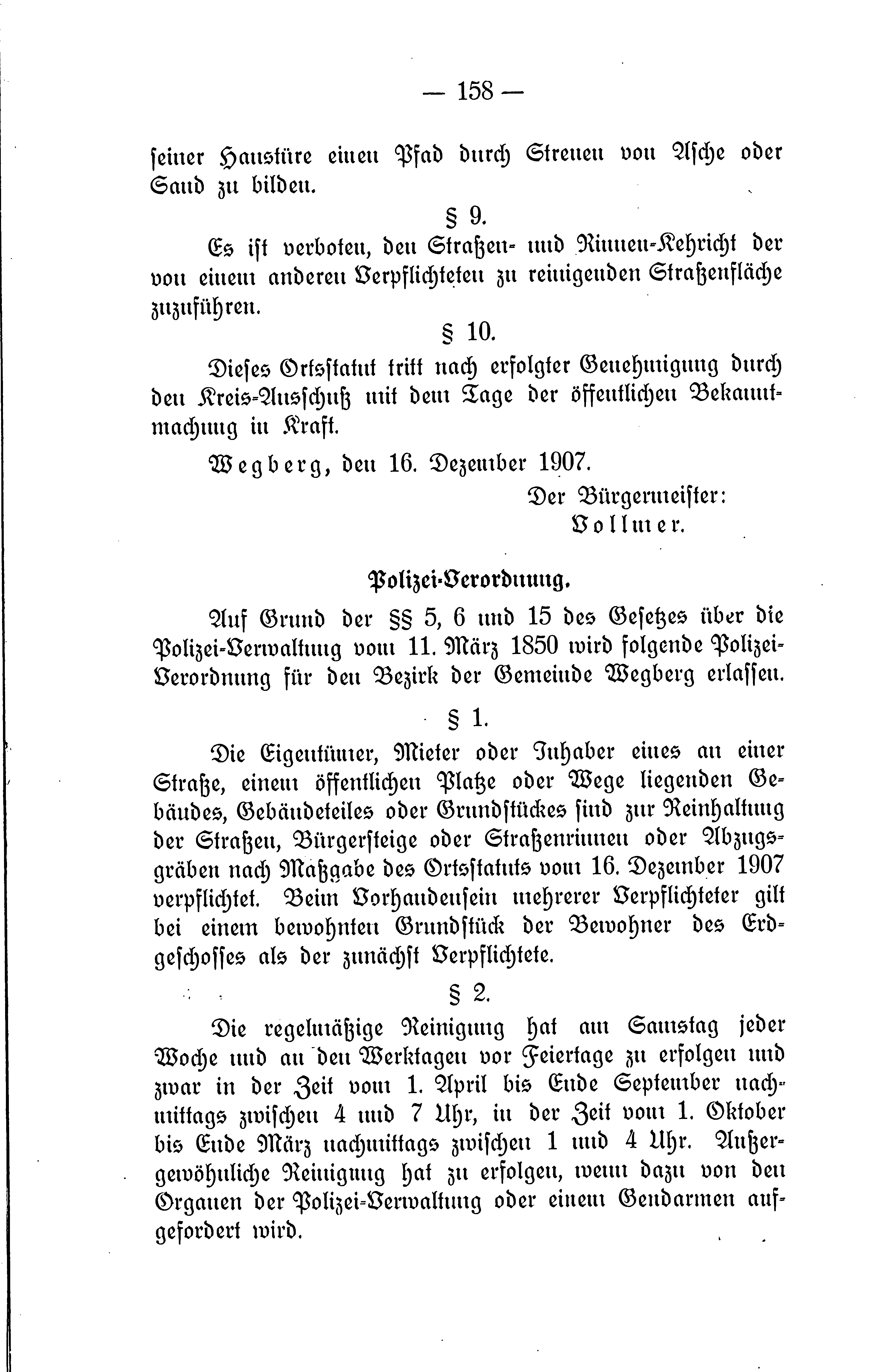 {{NE}}Auf Grund der §§ 5, 6 und 15 des Gesetzes über die Polizei-Verwaltung vom 11. März 1850 wird folgende Polizei-Verordnung für den Bezirk der Gemeinde Wegberg erlassen. | |||