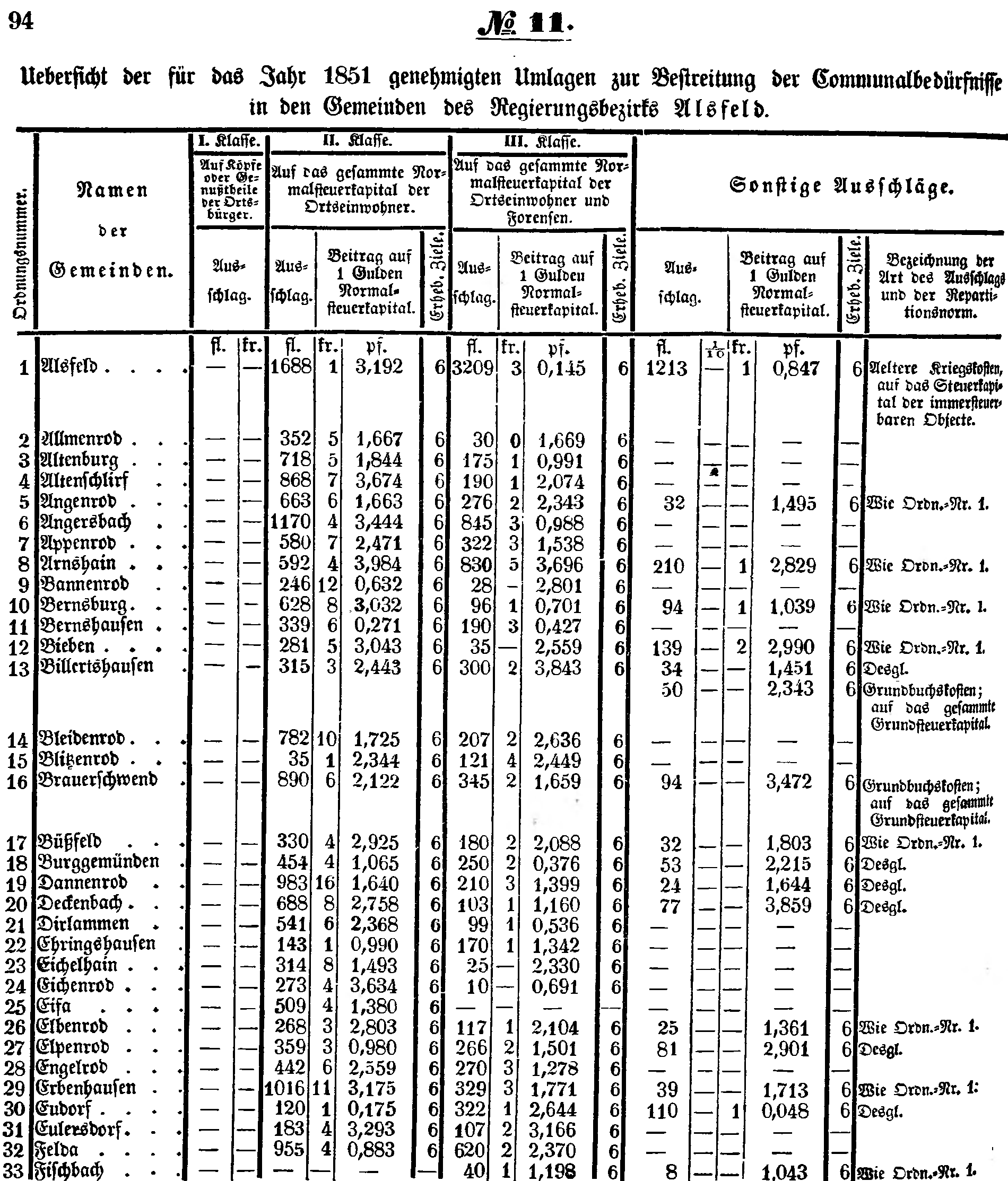 Uebersicht der für das Jahr 1851 genehmigten Umlagen zur Bestreitung der Communalbedürfnisse