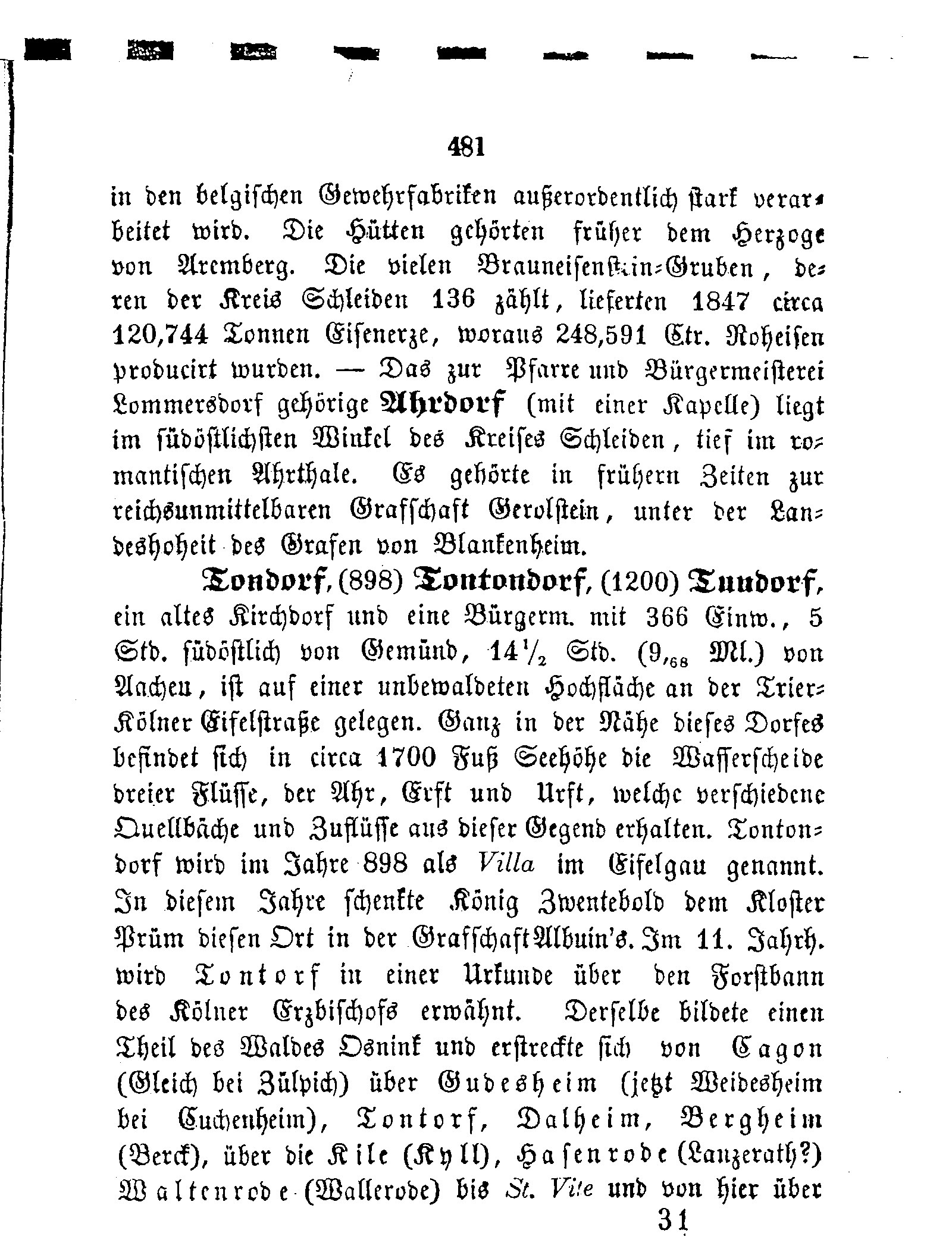 in den belgischen Gewehrfabriken außerordentlich stark verarbeitet wird. Die Hütten gehörten früher dem Herzoge von Aremberg. Die vielen Brauneisenstein-Gruben, deren der Kreis Schleiden 136 zählt, lieferten 1847 circa 120,744 Tonnen Eisenerze, woraus 248,591 Ctr. Roheisen producirt wurden. — Das zur Pfarre und Bürgermeisterei Lommersdorf gehörige Ahrdorf (mit einer Kapelle) liegt im südöstlichsten Winkel des Kreises Schleiden, tief im romantischen Ahrthale. Es gehörte in frühern Zeiten zur reichsunmittelbaren Grafschaft Gerolstein, unter der Landeshoheit des Grafen von Blankenheim.