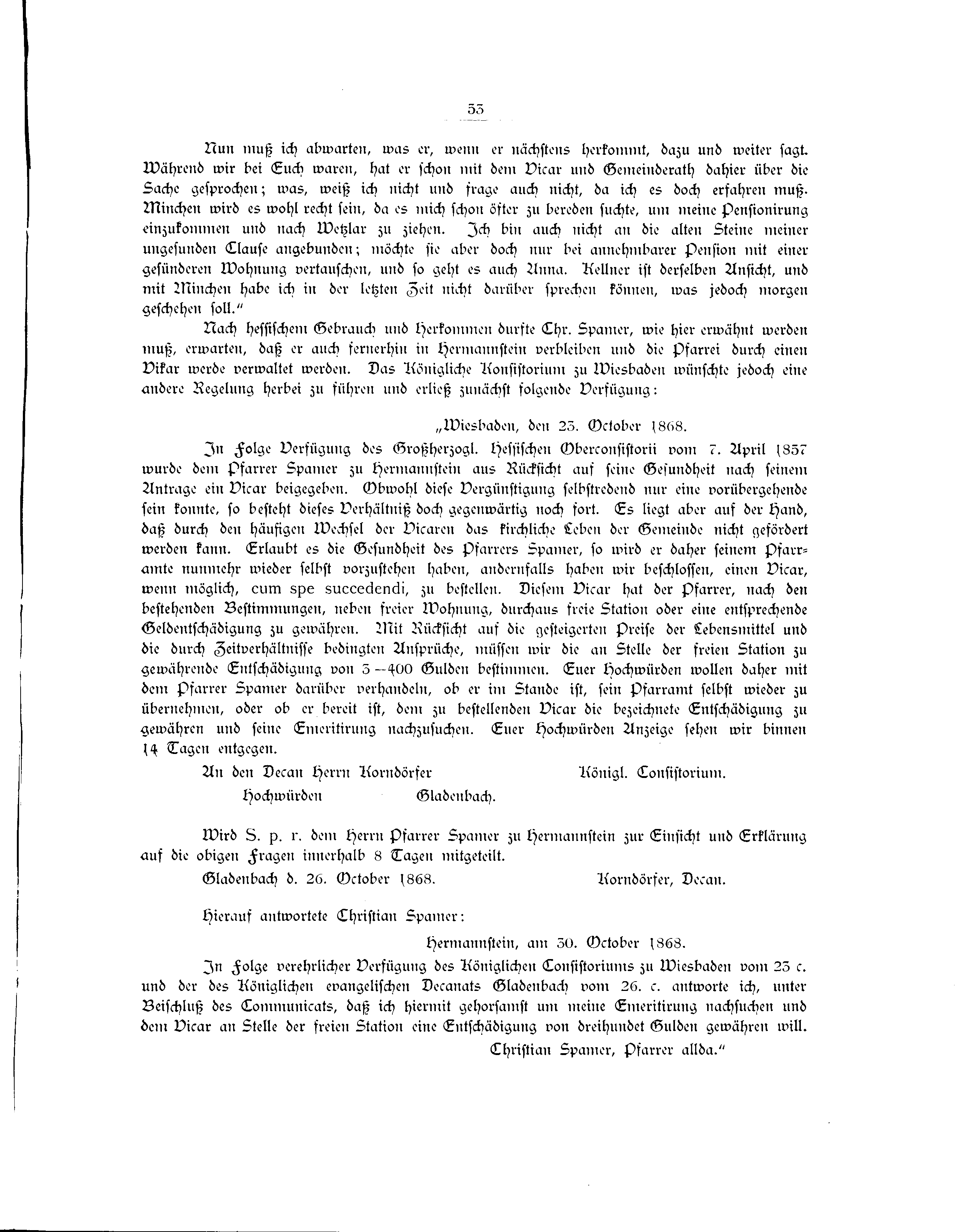 In Folge Verfügung des Großherzogl. Hessischen Oberconsistorii vom 7. April 1857 wurde dem Pfarrer Spamer zu Hermannstein aus Rücksicht auf seine Gesundheit nach seinem Antrage ein Vicar beigegeben. Obwohl diese Vergünstigung selbstredend nur eine vorübergehende sein konnte, so besteht dieses Verhältniß doch gegenwärtig noch fort. Es liegt aber auf der Hand, daß durch den häufigen Wechsel der Vicaren das kirchliche Leben der Gemeinde nicht gefördert werden kann. Erlaubt es die Gesundheit des Pfarrers Spamer, so wird er daher seinem Pfarramte nunmehr wieder selbst vorzustehen haben, andernfalls haben wir beschlossen, einen Vicar, wenn möglich, cum spe succedendi, zu bestellen. Diesem Vicar hat der Pfarrer, nach den bestehenden Bestimmungen, neben freier Wohnung, durchaus freie Station oder eine entsprechende Geldentschädigung zu gewähren. Mit Rücksicht auf die gesteigerten Preise der Lebensmittel und die durch Zeitverhältnisse bedingten Ansprüche, müssen wir die an Stelle der freien Station zu gewährende Entschädigung von 3—400 Gulden bestimmen. Euer Hochwürden wollen daher mit dem Pfarrer Spamer darüber verhandeln, ob er im Stande ist, sein Pfarramt selbst wieder zu übernehmen, oder ob er bereit ist, dem zu bestellenden Vicar die bezeichnete Entschädigung zu gewähren und seine Emeritirung nachzusuchen. Euer Hochwürden Anzeige sehen wir binnen 14 Tagen entgegen.