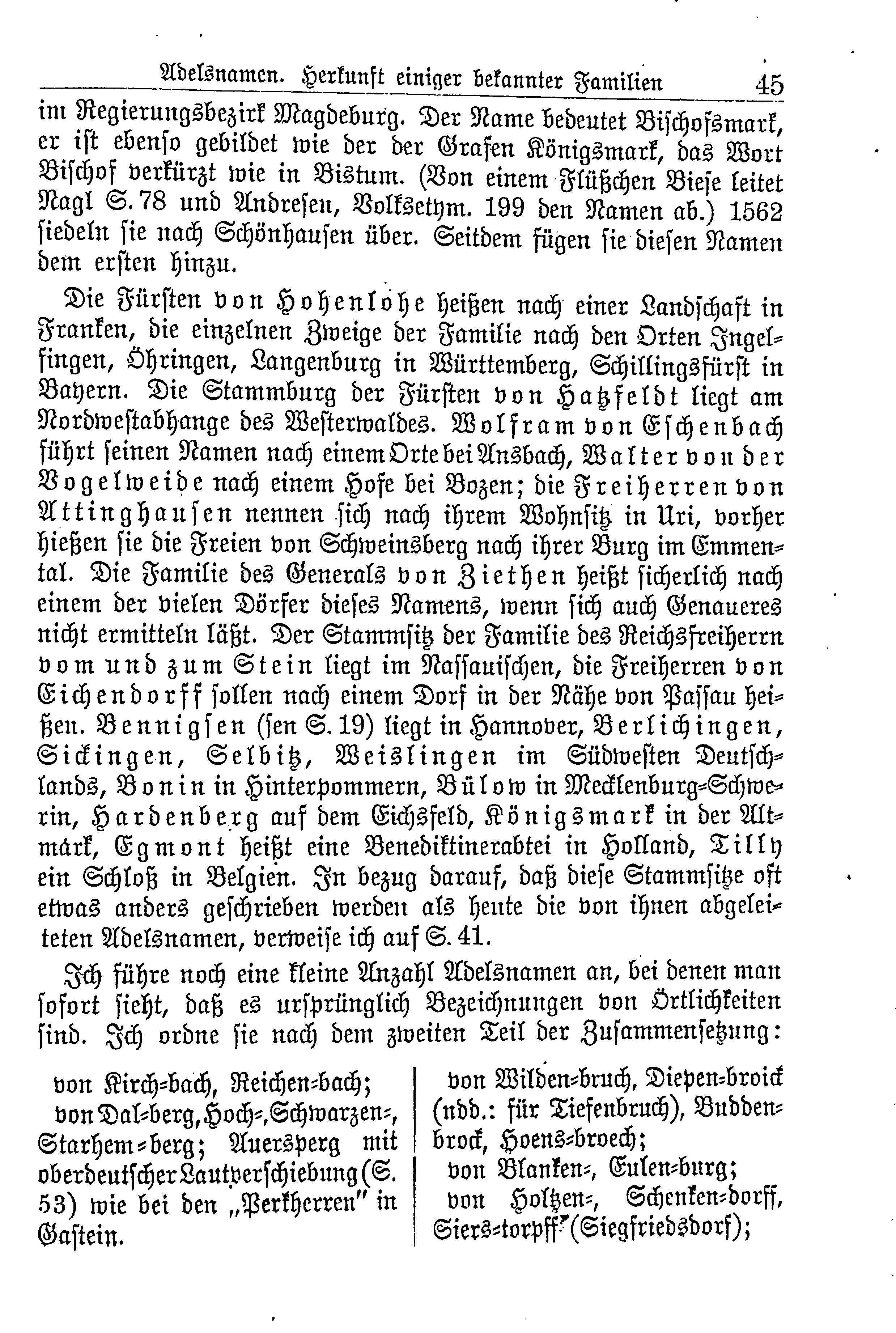 Die Fürsten von Hohenlohe heißen nach einer Landschaft in Franken, die einzelnen Zweige der Familie nach den Orten Ingelfingen, Ohringen, Langenburg in Württemberg, Schillingsfürst in Bayern. Die Stammburg der Fürsten von Hatzfeldt liegt am Nordwestabhange des Westerwaldes. Wolfram von Eschenbach führt seinen Namen nach einem Orte bei Ansbach, Walter von der Vogelweide nach einem Hofe bei Bozen; die Freiherren von Attinghausen nennen sich nach ihrem Wohnsitz in Uri, vorher hießen sie die Freien von Schweinsberg nach ihrer Burg im Emmental. Die Familie des Generals von Ziethen heißt sicherlich einem der vielen Dörfer dieses Namens, wenn sich auch Genaueres nicht ermitteln läßt. Der Stammsitz der Familie des Reichsfreiherrn vom und zum Stein liegt im Nassauischen, die Freiherren von Eichendorff sollen nach einem Dorf in der Nähe von Passau heißen. Bennigsen (sen S. 19) liegt in Hannover, Berlichingen, Sickingen, Selbitz, Weislingen im Südwesten Deutschlands, Bonin in Hinterpommern, Bülow in Mecklenburg-Schwerin, Hardenberg auf dem Eichsfeld, Königsmark in der Altmark, Egmont heißt eine Benediktinerabtei in Holland, Tilly ein Schloß in Belgien. In bezug darauf, daß diese Stammsitze oft etwas anders geschrieben werden als heute die von ihnen abgeleiteten Adelsnamen, verweise ich auf S. 41.