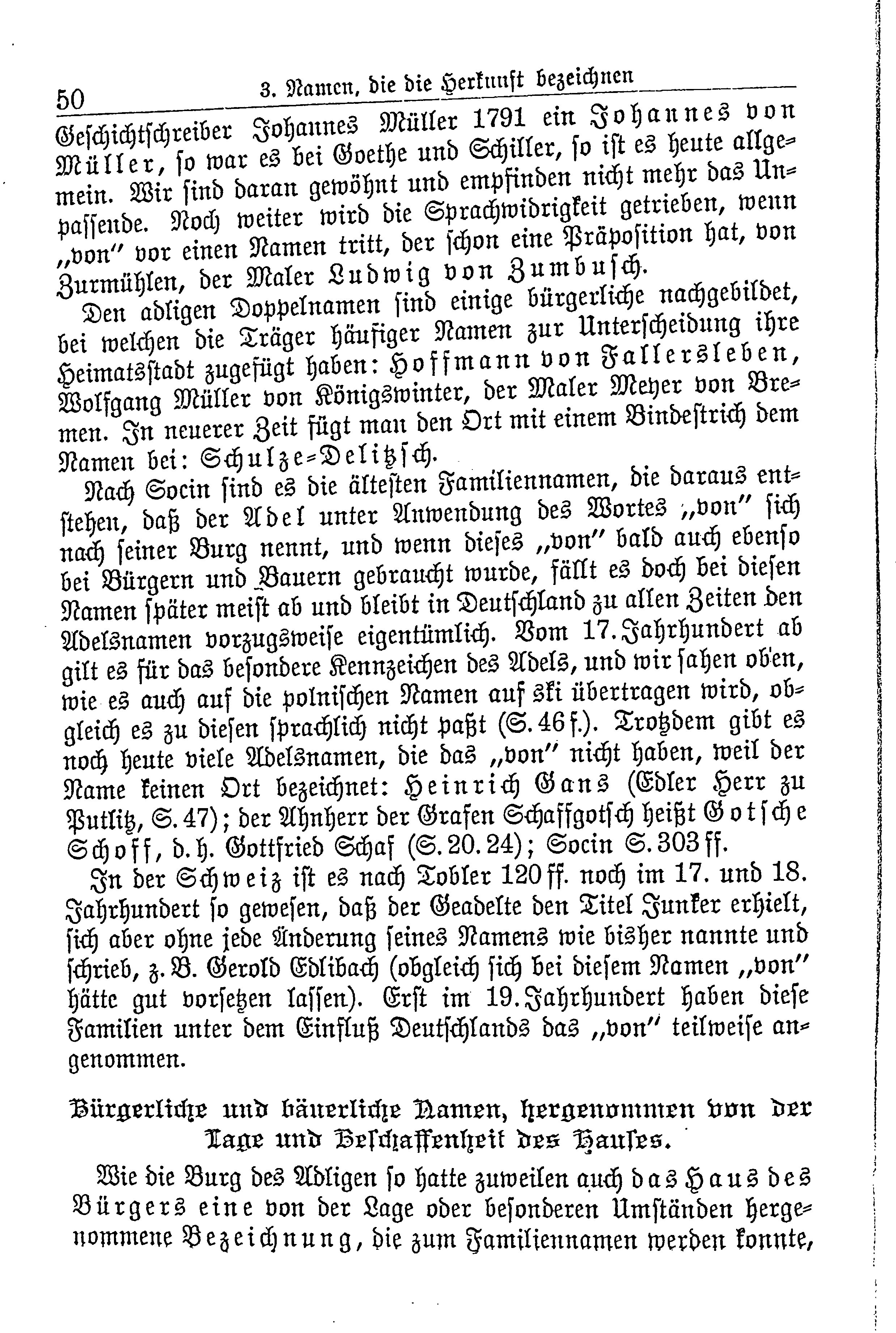 Nach Socin sind es die ältesten Familiennamen, die daraus entstehen, daß der Adel unter Anwendung des Wortes „von“ sich nach seiner Burg nennt, und wenn dieses „von“ bald auch ebenso bei Bürgern und Bauern gebraucht wurde, fällt es doch bei diesen Namen später meist ab und bleibt in Deutschland zu allen Zeiten den Adelsnamen vorzugsweise eigentümlich. Vom 17. Jahrhundert ab gilt es für das besondere Kennzeichen des Adels, und wir sahen oben, wie es auch auf die polnischen Namen aus ski übertragen wird, obgleich es zu diesen sprachliche nicht passt (S. 46f.). Trotzdem gibt es noch heute viele Adelsnamen, die das „von“ nicht haben, weil der Name keinen Ort bezeichnet: Heinrich Gans (Edler Herr zu Putlitz, S. 47); der Ahnherr der Grafen Schaffgotsch heißt Gotsche Schoff, d.h. Gottfried Schaf (S. 20. 24); Socin S. 303 ff.