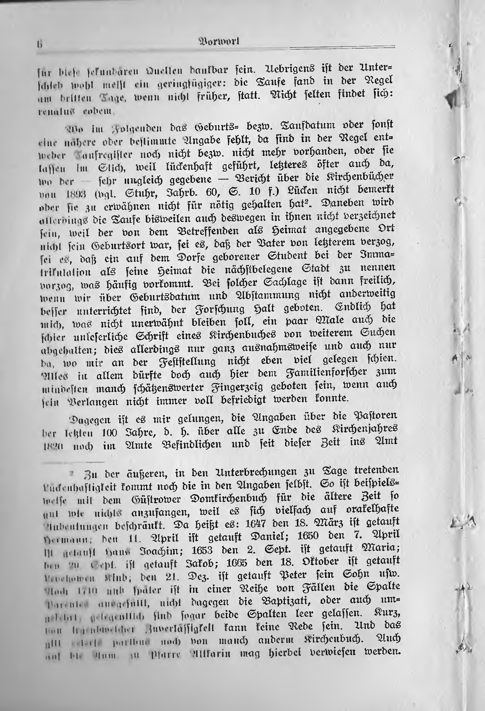 Wo im Folgenden das Geburts- bezw. Taufdatum oder sonst eine nähere oder bestimmte Angabe fehlt, da sind in der Regel entweder Taufregister noch nicht bezw. nicht mehr vorhanden, oder sie lassen im Stich, weil lückenhaft geführt, letzeres öfter auch da, wo der — sehr ungleich gegebene — Bericht über die Kirchenbücher von 1893 (vgl. Stuhr, Jahrb. 60, S. 10 f.) Lücken nicht bemerkt oder sie zu erwähnen, nicht für nötig gehalten hat<ref>Zu der äußeren, in den Unterbrechungen zu Tage tretenden Lückenhaftigkeit kommt noch die in den Angaben selbst. So ist beispielsweise mit dem Güstower Domkirchenbuch für die ältere Zeit so gut wie nichts anzufangen, weil es sich vielfach auf orakelhafte Andeutungen beschränkt. Da heißt es: 1647 den 18. März ist getauft Hermann: den 11. April ist getauft Daniel; 1650 den 7. April ist getauft Hans Joachim; 1653 den 2. Sept. ist getauft Maria; den 29. Sept. ist getauft Jakob; 1665 den 18. Oktober ist getauft Levetzowen Kind; den 21. Dez. ist getauft Peter sein Sohn usw. Noch 1710 und später ist in einer Reihe von Fällen die Spalte Parentes ausgefüllt, nicht dagegen die Baptizati, oder auch umgekehrt; gelegentlich sind sogar beide Spalten leer gelassen. Kurz von irgendwelcher Zuverlässigkeit kann keine Rede sein. Und das gilt ceteris paribus noch von manch anderm Kirchenbuch. Auch auf die Anm. zu Pfarre Altkarin mag hierbei verwiesen werden.</ref>. Daneben wird allerdings die Taufe bisweilen auch deswegen in ihnen nicht verzeichnet sein, weil der von dem Betreffenden als Heimat angegebene Ort nicht sein Geburtsort war, sei es, daß der Vater von letzterem verzog, sei es, daß ein auf dem Dorfe geborener Student bei der Immatrikulation als seine Heimat die nächstbelegene Stadt zu nennen vorzog, was häufig vorkommt. Bei solcher Sachlage ist dann freilich, wenn wir über Geburtsdatum und Abstammung nicht anderweitig besser unterrichtet sind, der Forschung Halt geboten. Endlich hat mich, was nicht unerwähnt bleiben soll, ein paar Male auch die schier unleserliche Schrift eines Kirchenbuches von weiterem Suchen abgehalten; dies allerdings nur ganz ausnahmsweise und auch | Wo im Folgenden das Geburts- bezw. Taufdatum oder sonst eine nähere oder bestimmte Angabe fehlt, da sind in der Regel entweder Taufregister noch nicht bezw. nicht mehr vorhanden, oder sie lassen im Stich, weil lückenhaft geführt, letzeres öfter auch da, wo der — sehr ungleich gegebene — Bericht über die Kirchenbücher von 1893 (vgl. Stuhr, Jahrb. 60, S. 10 f.) Lücken nicht bemerkt oder sie zu erwähnen, nicht für nötig gehalten hat<ref>2) Zu der äußeren, in den Unterbrechungen zu Tage tretenden Lückenhaftigkeit kommt noch die in den Angaben selbst. So ist beispielsweise mit dem Güstower Domkirchenbuch für die ältere Zeit so gut wie nichts anzufangen, weil es sich vielfach auf orakelhafte Andeutungen beschränkt. Da heißt es: 1647 den 18. März ist getauft Hermann: den 11. April ist getauft Daniel; 1650 den 7. April ist getauft Hans Joachim; 1653 den 2. Sept. ist getauft Maria; den 29. Sept. ist getauft Jakob; 1665 den 18. Oktober ist getauft Levetzowen Kind; den 21. Dez. ist getauft Peter sein Sohn usw. Noch 1710 und später ist in einer Reihe von Fällen die Spalte Parentes ausgefüllt, nicht dagegen die Baptizati, oder auch umgekehrt; gelegentlich sind sogar beide Spalten leer gelassen. Kurz, von irgendwelcher Zuverlässigkeit kann keine Rede sein. Und das gilt ceteris paribus noch von manch anderm Kirchenbuch. Auch auf die Anm. zu Pfarre Altkarin mag hierbei verwiesen werden.</ref>. Daneben wird allerdings die Taufe bisweilen auch deswegen in ihnen nicht verzeichnet sein, weil der von dem Betreffenden als Heimat angegebene Ort nicht sein Geburtsort war, sei es, daß der Vater von letzterem verzog, sei es, daß ein auf dem Dorfe geborener Student bei der Immatrikulation als seine Heimat die nächstbelegene Stadt zu nennen vorzog, was häufig vorkommt. Bei solcher Sachlage ist dann freilich, wenn wir über Geburtsdatum und Abstammung nicht anderweitig besser unterrichtet sind, der Forschung Halt geboten. Endlich hat mich, was nicht unerwähnt bleiben soll, ein paar Male auch die schier unleserliche Schrift eines Kirchenbuches von weiterem Suchen abgehalten; dies allerdings nur ganz ausnahmsweise und auch nur da, wo mir an der Feststellung nicht eben viel gelegen schien. Alles in allem dürfte doch auch hier dem Familienforscher zum mindesten manch schätzenswerter Fingerzeig geboten sein, wenn auch sein Verlangen nicht immer voll befriedigt werden konnte. | ||