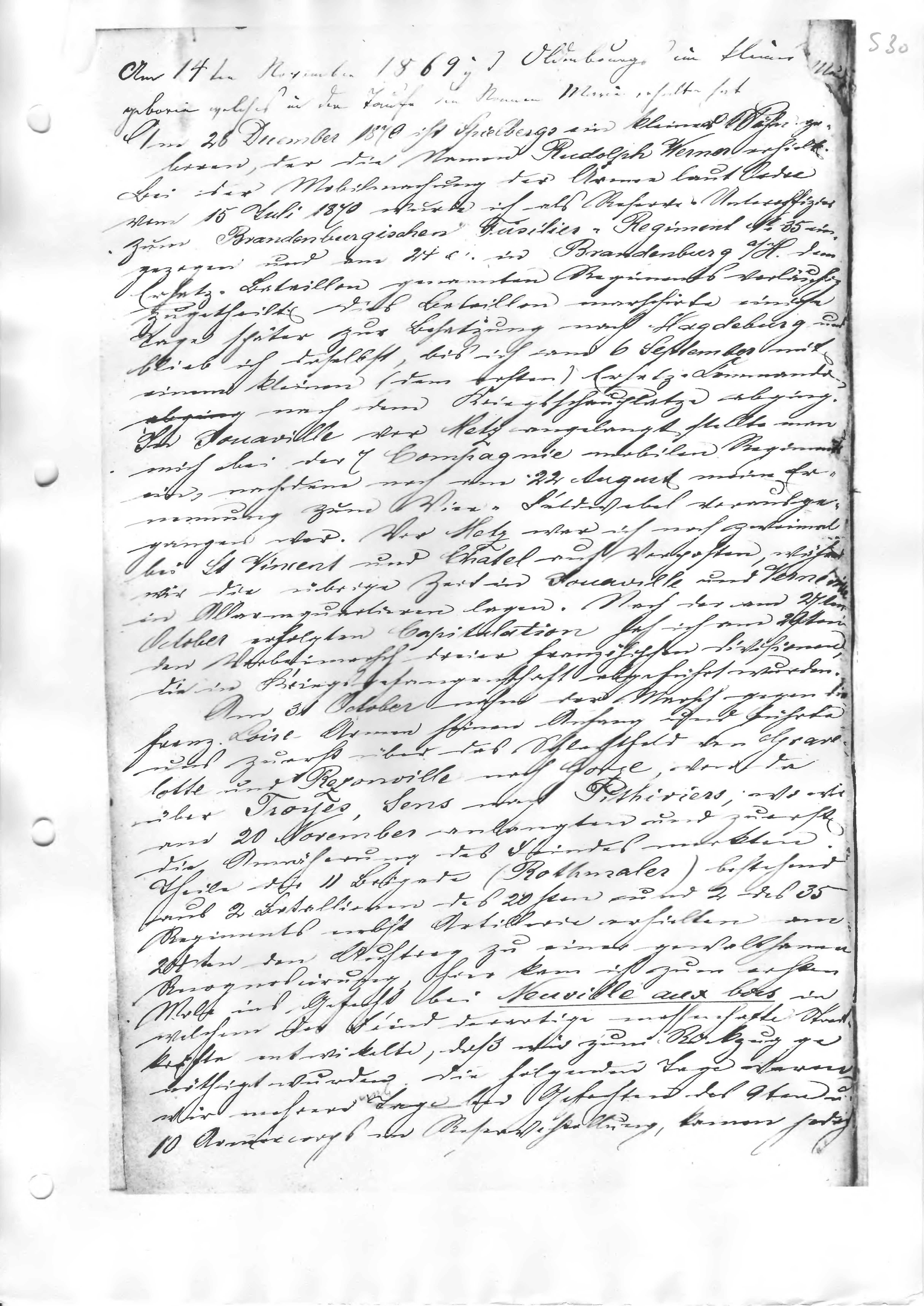 Bei der Mobilmachung der Arme laut Ordre vom 15. Juli 1870 wurde Ich als Reserve - Unteroffizier zum Brandenburgschen Füsilier-Regiment Nr. 35 eingezogen und am 24. in Brandenburg a.H. dem Ersatz-Bataillon genannten Regiments vorläufig zugeteilt. Dies Bataillon marschierte einige Tage später zur Besatzung nach Magdeburg und blieb ich daselbst, bis ich am 6. September mit einem kleinen (dem ersten) Ersatz-Kommando nach dem Kriegsschauplatze abging. In Jonville vor Metz angelangt, stellte man mich bei der 7. Compagnie mobilen Regiments ein, nach dem noch am 22. August meine Ernennung zum Vicefeldwebel vorausgegangen war. Vor Metz war ich noch zweimal bei St.Vincent und Chatel auf Vorposten, während wir die übrige Zeit in Jonaville und Vernéville in Alarmquartieren lagen. Nach der am 27. October erfolgten Capitulation sah ich am 29 ten den Vorbeimarsch, dreier französischer Divisionen, die in Kriegsgefangenschaft abgeführt wurden. Am 3l. October nahm der Marsch gegen die franz. Loire-Armee seinen Anfang und führte uns zuerst über das Schlachtfeld von Gravelotte Resonville nach Gorze, von da über Troyes, Sens nach Pithiviers, wo wir am 20 ten November anlangten und zuerst die An-näherung des Feindes merkten. Teile der ll.3 Brigade (Rothmaler) bestehend aus 2 Bataillonen des 20 sten und 2 ten des 35. Regiments nebst Artillerie, erhielten am 24 ten den Auftrag zu einer gewaltsames Recognoszierung. Hier kam ich zum ersten Male ins Gefecht bei Neuville aux bois, in welchem der Feind derartige massenhafte Streitkräfte entwikkelte, dass wir zum Rückzuge genötigt wurden. Die folgenden Tage waren wir mehrmals bei Gefechten des 9 ten und 10 ten Armeecorps in Reservestellung, kamen jedoch