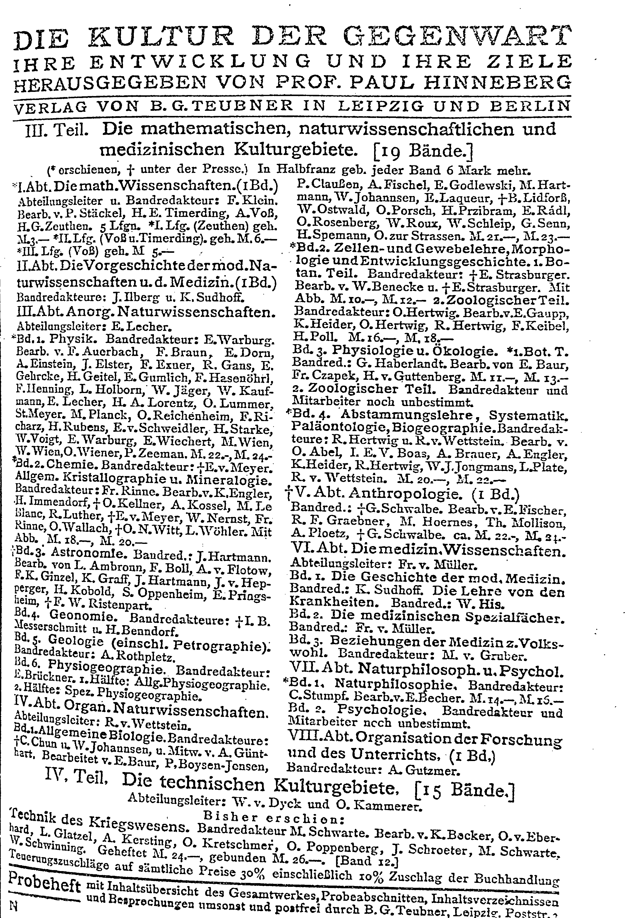 ===III. Teil. Die mathematischen, naturwissenschaftlichen und medizinischen Kulturgebiete. (19 Bände.]=== | ===III. Teil. Die mathematischen, naturwissenschaftlichen und medizinischen Kulturgebiete. (19 Bände.]=== | ||