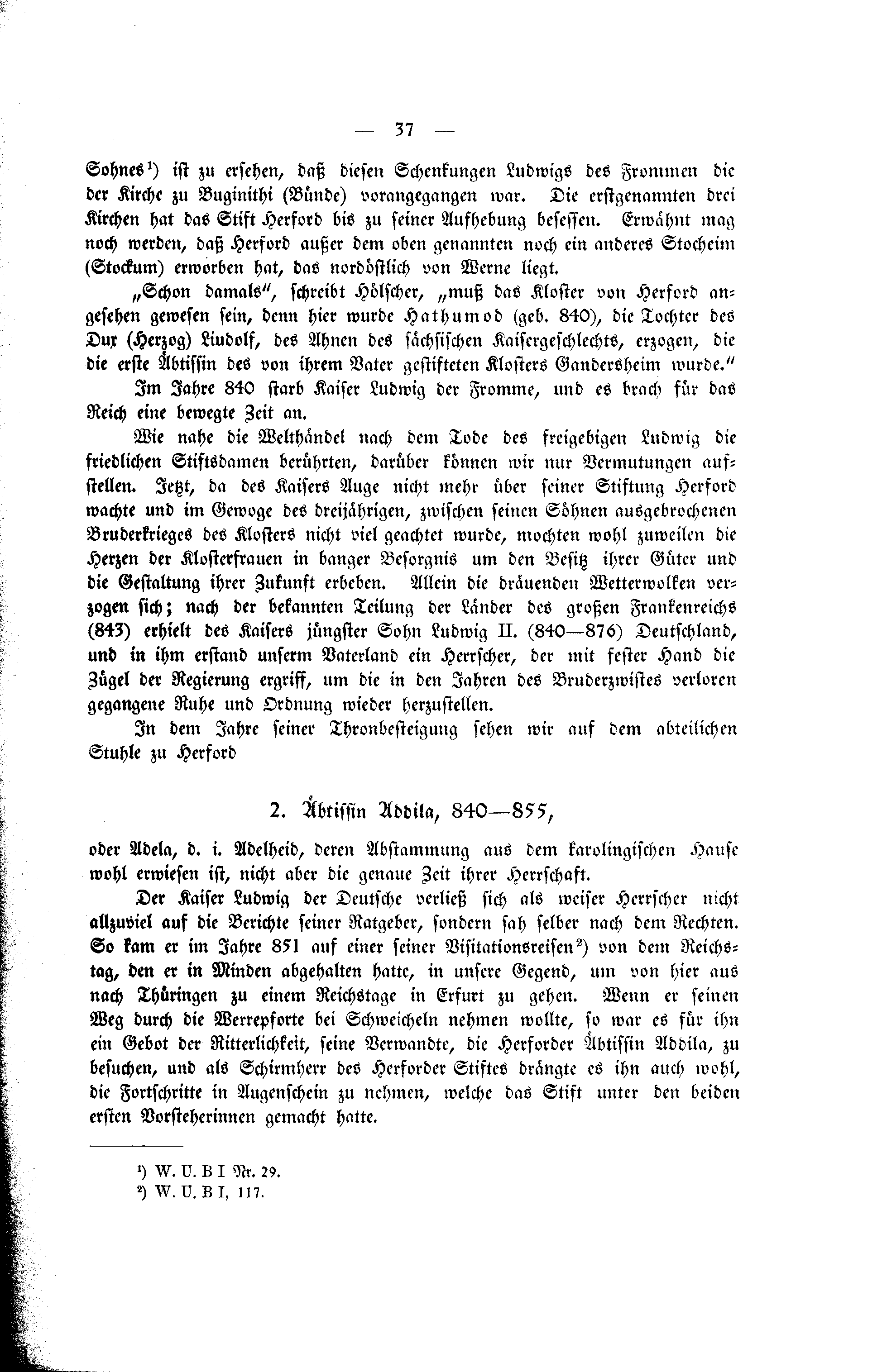 Der Kaiser Ludwig der Deutsche verließ sich als weiser Herrscher nicht allzuviel auf die Berichte seiner Ratgeber, sondern sah selber nach dem Rechten. So kam er im Jahre 851 auf einer seiner Visitationsreisen<ref>W. U. B I, 117.</ref> von dem Reichstag, den er in Minden abgehalten hatte, in unsere Gegend, um von hier aus nach Thüringen zu einem Reichstage in Erfurt zu gehen. Wenn er seinen Weg durch die Werrepforte bei Schmeicheln nehmen wollte, so war es für ihn ein Gebot der Ritterlichkeit, seine Verwandte, die Herforder Äbtissin Addila, zu besuchen, und als Schirmherr des Herforder Stiftes drängte es ihn auch wohl, die Fortschritte in Augenschein zu nehmen, welche das Stift unter den beiden ersten Vorsteherinnen gemacht hatte. | |||