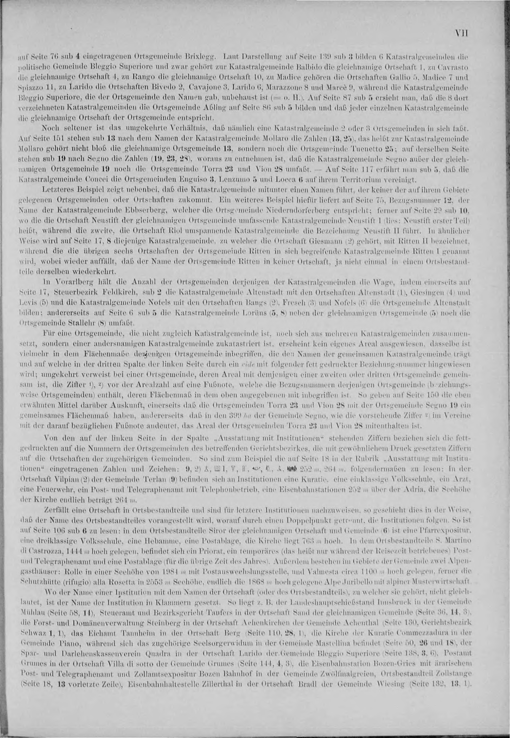auf Seite 76 sub 4 eingetragenen Ortgemeinde Brixlegg. Laut Darstellung auf Seite 139 sub 3 bilden 6 Katastralgemeinden die politische Gemeinde Bleggio Superiore und zwar gehört zur Katastralgemeinde Balbido die gleichnamige Ortschaft 1, zu Cavrasto die gleichnamige Ortschaft 4, zu Rango die gleichnamige Ortschaft 10, zu Madice gehören die Ortschaften Gallio 5, Madice 7 und Spiazzo 11, zu Larido die Ortschaften Bivedo 2, Cavajone 3, Larido 6, Marazzone 8 und Marcè 9, während die Katastralgemeinde Bleggio Superiore, die der Ortsgemeinde den Namen gab, unbehaust ist (= o.H.). Auf Seite 87 sub 5 ersieht man, daß die 8 dort verzeichneten Katastralgemeinden die Ortsgemeinde Aßling auf Seite 86 sub 5 bilden und daß jeder einzelnen Katastralgemeinde die gleichnamige Ortschaft der Ortsgemeinde entspricht.