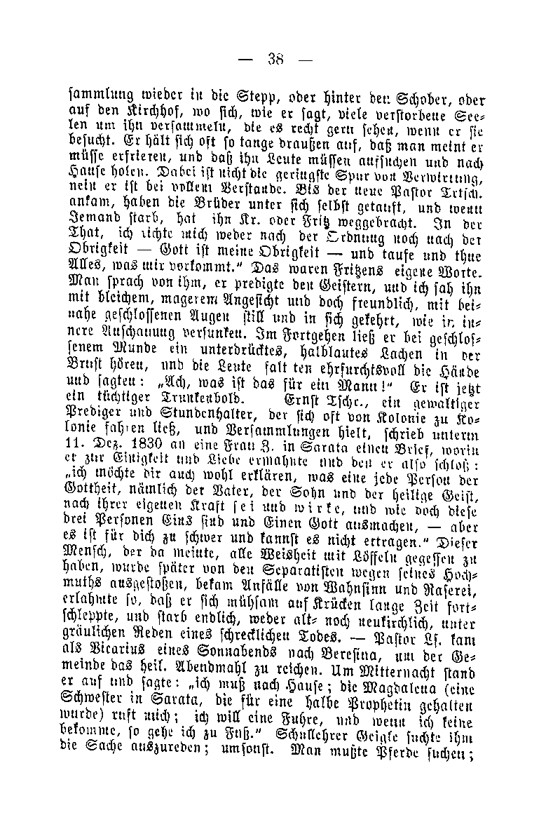 sammlung wieder in die Stepp, oder hinter den Schober, oder auf den Kirchhof, wo sich, wie er sagt, viele verstorbene Seelen um ihn versammeln, die es recht gerne sehen, wenn er sie besucht. Er hält sich oft so lange draußen auf, daß man meint er müsse erfrieren, und daß ihn Leute müssen aufsuchen und nach Hause holen. Dabei ist nciht die geringste Spur von Verwirrung, nein er ist bei volem verstande. Bis der neue Pastor Trtsch??. ankam, ahben die brüder unter sich selbst getauft, und wenn Jemand starb, hat ihn ?r. oder Fritz weggebracht. In der That, ich richte mich weder nach der Ordnung noch nach der Obrigkeit - Gott ist meine Obrigkeit - und taufe und thue Alles, was mir vorkommt.“ Das waren Fritzens eigene Worte.
