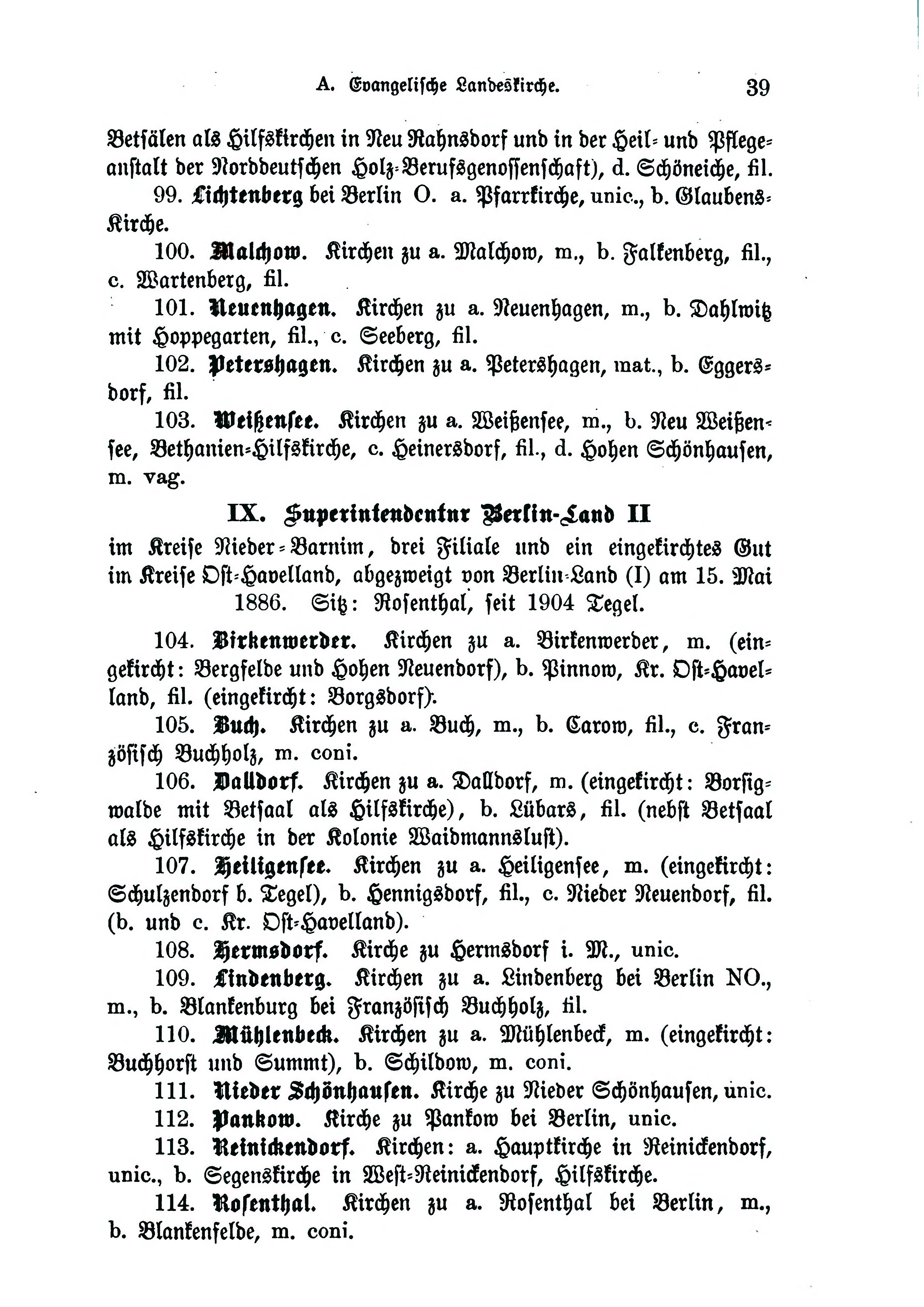 - 106. Dalldorf. Kirchen zu a. Dalldorf, m. (eingekircht: Borsigwalde mit Betsaal als Hilfskirche), b. Lübars, fil. (nebst Betsaal als Hilfskirche in der Kolonie Waidmannslust).