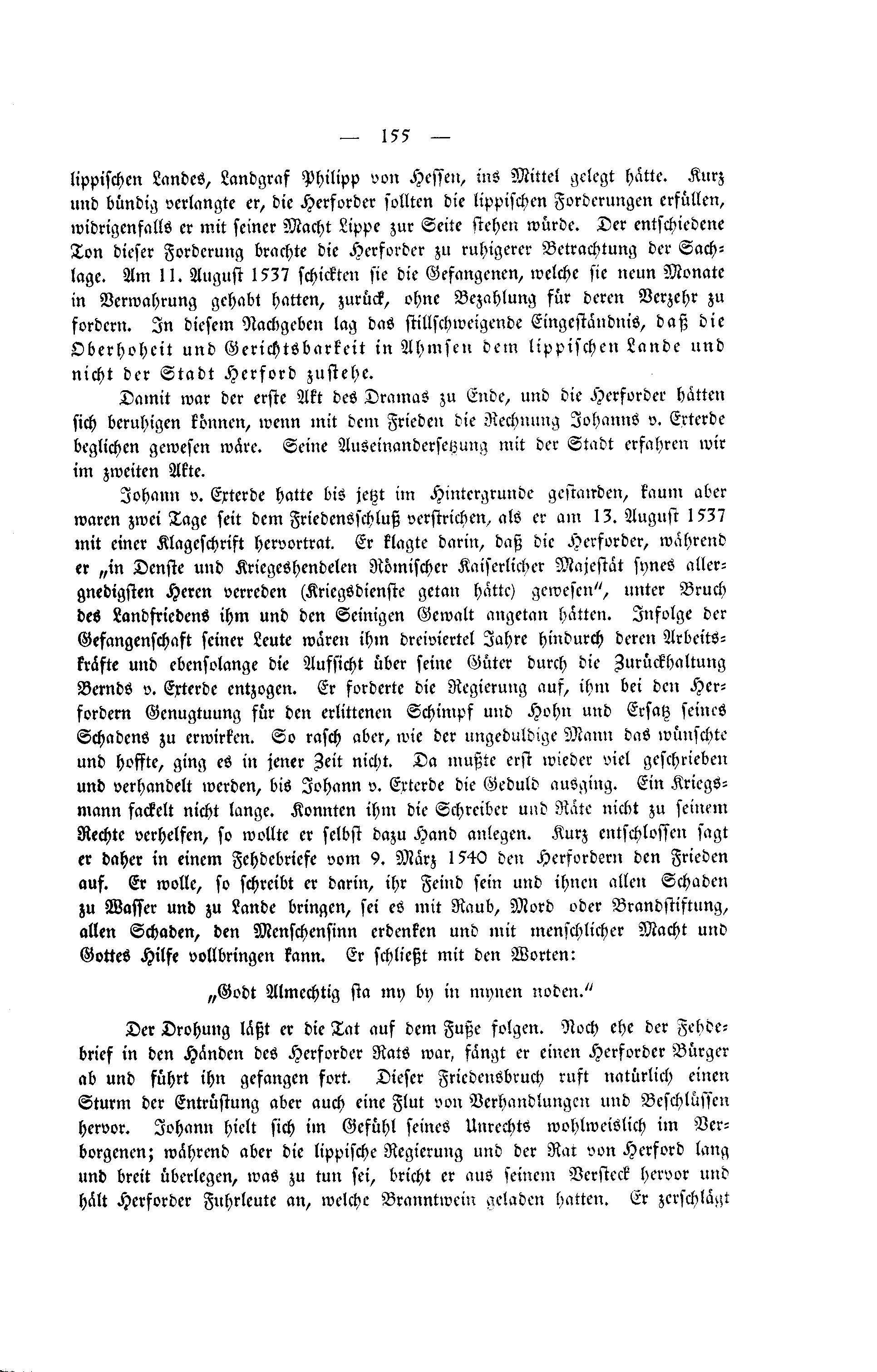 Johann v. Exterde hatte bis jetzt im Hintergrunde gestanden, kaum aber waren zwei Tage seit dem Friedensschluß verstrichen, als er am 13. August 1537 mit einer Klageschrift hervortrat. Er klagte darin, daß die Herforder, wahrend er „in Denste und Kriegeshendelen Römischer Kaiserlicher Majestät synes allergnedigsten Heren verreden (Kriegsdienste getan hatte) gewesen“, unter Bruch des Landfriedens ihm und den Seinigen Gewalt angetan hätten. Infolge der Gefangenschaft seiner Leute waren ihm dreiviertel Jahre hindurch deren Arbeitskräfte und ebensolange die Aufsicht über seine Güter durch die Zurückhaltung Bernds v. Exterde entzogen. Er forderte die Regierung auf, ihm bei den Herfordern Genugtuung für den erlittenen Schimpf und Hohn und Ersatz seines Schadens zu erwirken. So rasch aber, wie der ungeduldige Mann das wünschte und hoffte, ging es in jener Zeit nicht. Da mußte erst wieder viel geschrieben und verhandelt werden, bis Johann v. Exterde die Geduld ausging. Ein Kriegsmann fackelt nicht lange. Konnten ihm die Schreiber und Rate nicht zu seinem Rechte verhelfen, so wollte er selbst dazu Hand anlegen. Kurz entschlossen sagt er daher in einem Fehdebriefe vom 9. März 1540 den Herfordern den Frieden auf. Er wolle, so schreibt er darin, ihr Feind sein und ihnen allen Schaden zu Wasser und zu Lande bringen, sei es mit Raub, Mord oder Brandstiftung, allen Schaden, den Menschensinn erdenken und mit menschlicher Macht und Gottes Hilfe vollbringen kann. Er schließt mit den Worten: | |||