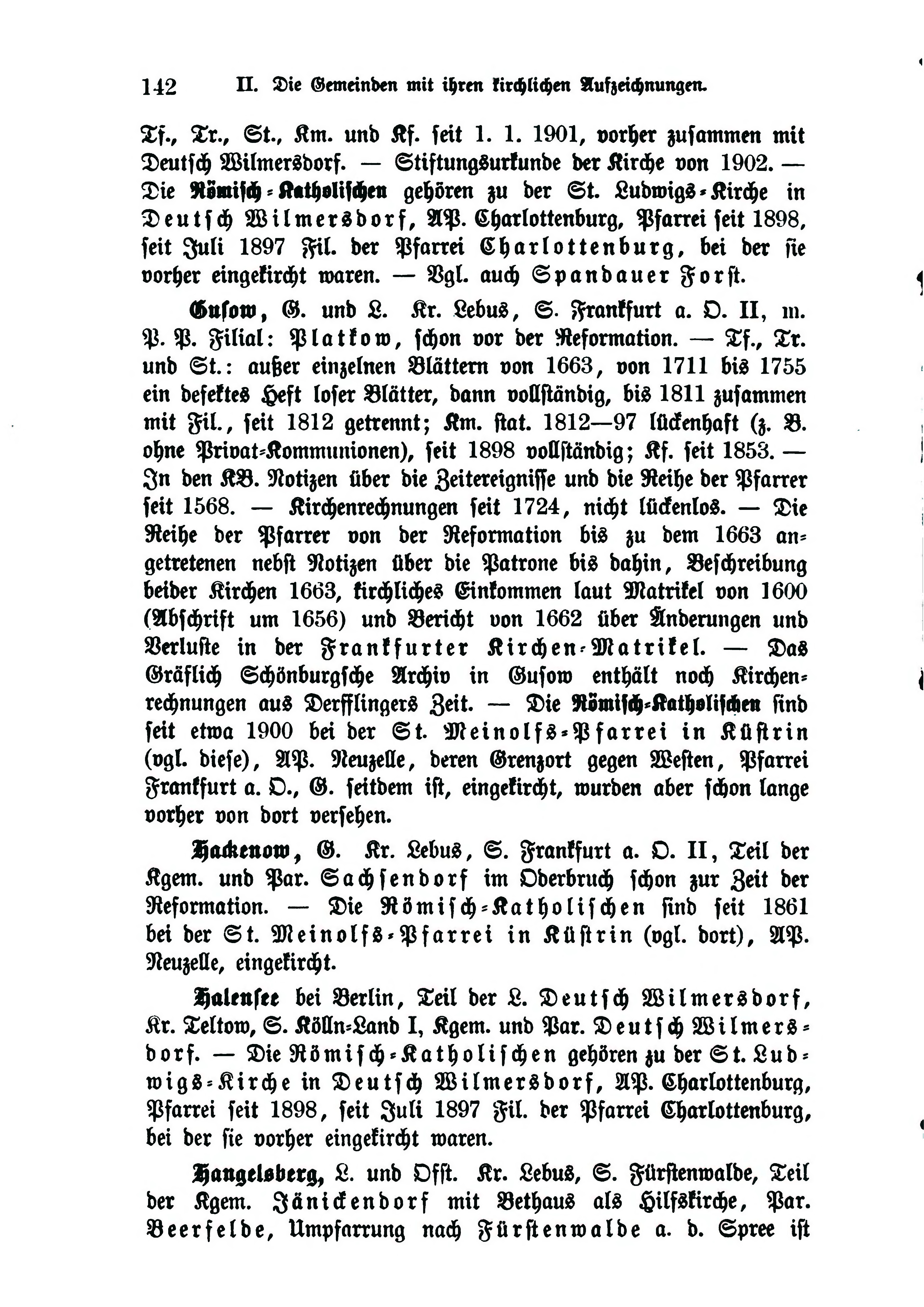 :'''Gusow'''. G. und L. Kr. Lebus, S. Frankfurt a. O. II, m. P. P. Mal: Platkow, schon vor der Reformation. — Tr. und St.: außer einzelnen Blättern von 1663, von 1711 bis 1755 ein desektes Heft loser Blätter, dann vollständig, bis 1811 zusammen mit, seit 1812 getrennt; Km. stat. 1812—97 lückenhaft (z. B. ohne Privat-Kommunionen), seit 1898 vollständig; Kf. seit 1853. — In den KB. Notizen über die Zeitereignisse und die Reihe der Pfarrer seit 1568. — Kirchenrechnungen seit 1724, nicht lückenlos. — Die Reihe der Pfarrer von der Reformation bis zu dem 1663 angetretenen nebst Notizen über die Patrone bis dahin, Beschreibung beider Kirchen 1663, kirchliches Einkommen laut Matrikel von 1600 (Abschrift um 1656) und Bericht von 1662 über Änderungen und Verluste in der Frankfurter Kirchen-Matrikel. — Das Gräflich Schönburgsche Archiv in Gusow enthält noch Kirchenrechnungen aus Derfflingers Zeit. — Die '''Römisch-Katholischen''' sind seit etwa 1900 bei der St. Meinolfs-Pfarrei in Küstrin (vgl. diese), AP. Neuzelle, deren Grenzort gegen Westen, Pfarrei Frankfurt a. O., G. seitdem ist, eingekircht, wurden aber schon lange vorher von dort versehen. | |||