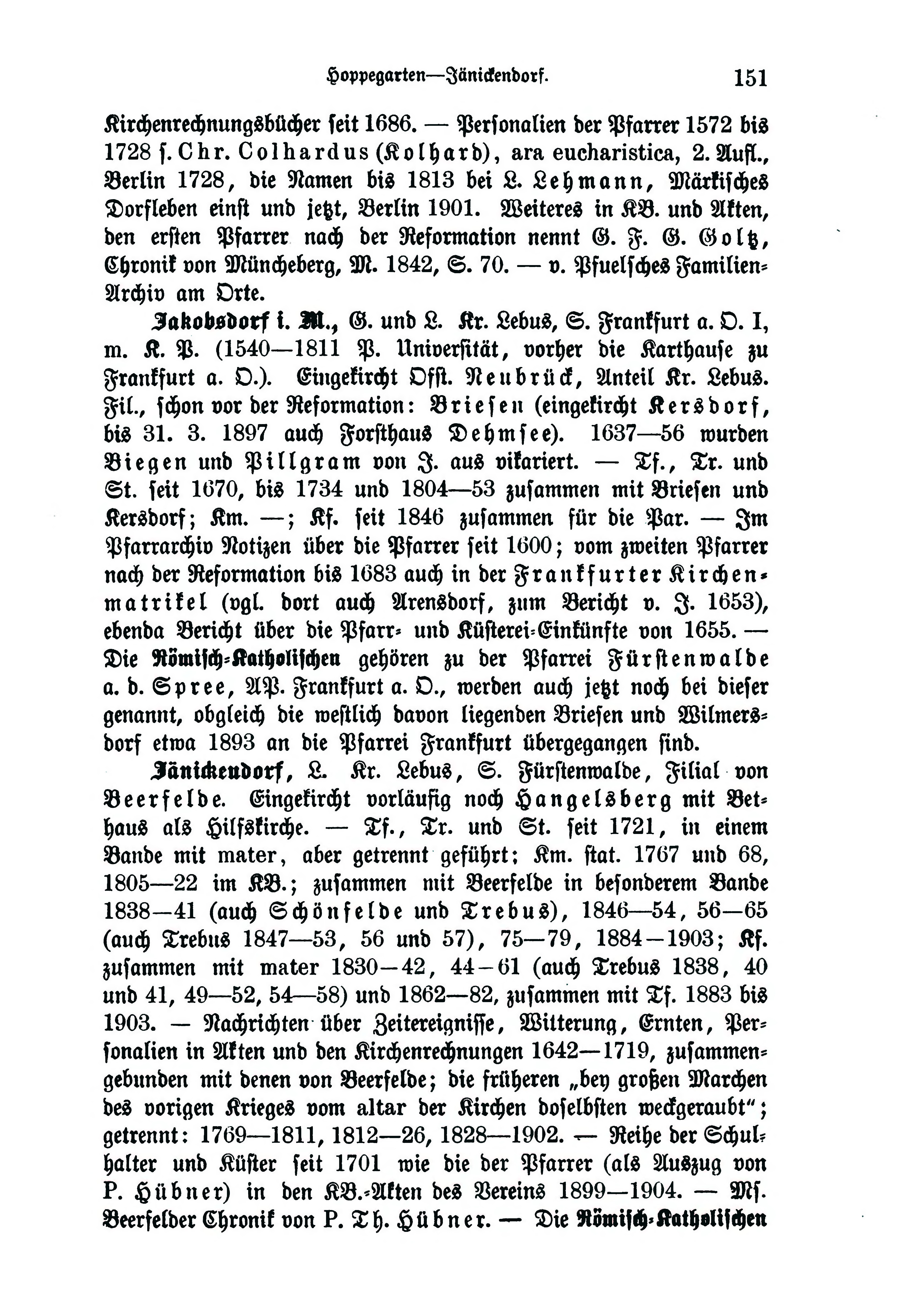 - Jänickendorf, L. Kr. Lebus, S. Fürstenwalde, Filial von Beerfelde. Eingekircht vorläufig noch Hangelsberg mit Bethaus als Hilfskirche. — Tr. und St. seit 1721, in einem Bande mit mater, aber getrennt geführt: Km. stat. 1767 und 68, 1805—22 im KB.; zusammen mit Beerfelde in besonderem Bande 1838-41 (auch Schönfelde und Trebus), 1846—54, 56-65 (auch Trebus 1847—53, 56 und 57), 75-79, 1884-1903; Kf. zusammen mit mater 1830-42, 44-61 (auch Trebus 1838, 40 und 41, 49—52, 54—58) und 1862—82, zusammen mit Tf. 1883 bis 1903. — Nachrichten über Zeitereignisse, Witterung, Ernten, Personalien in Akten und den Kirchenrechnungen 1642—1719, zusammengebunden mit denen von Beerfelde; die früheren „bey großen Marchen des vorigen Krieges vom Altar der Kirchen doselbsten weckgeraubt"; getrennt: 1769—1811, 1812—26, 1828—1902. - Reihe der Schulhalter und Küster seit 1701 wie die der Pfarrer (als Auszug von P. Hübner) in den KB.-Akten des Vereins 1899—1904. — Ms. Beerfelder Chronik von P. Th. Hübner. — Die Römisch-Katholischen