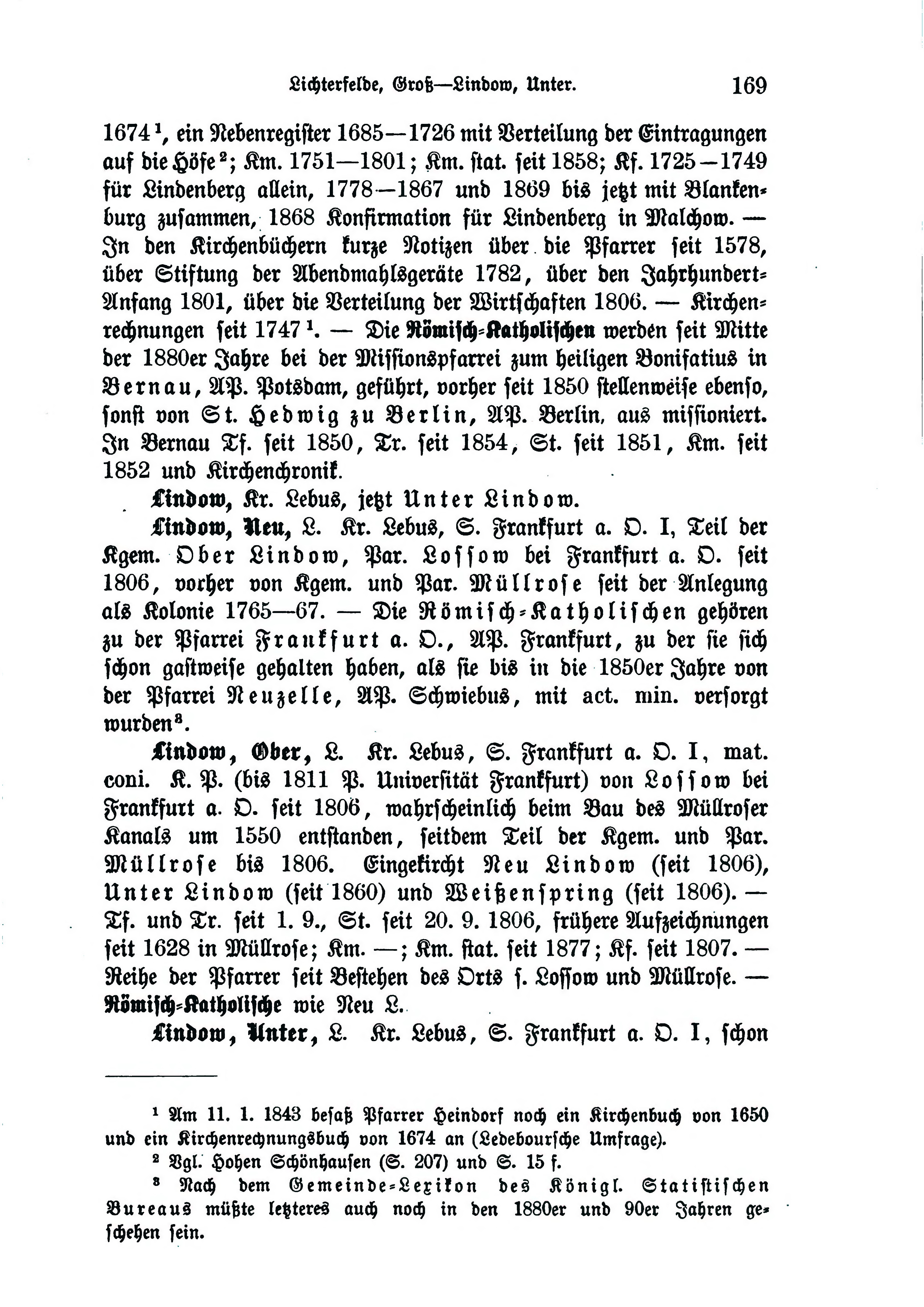 - Lindow, Neu, L. Kr. Lebus, S. Frankfurt a. O. I, Teil der Kgem. Ober Lindow, Par. Lossow bei Frankfurt a. O. seit 1806, vorher von Kgem. und Par. Müllrose seit der Anlegung als Kolonie 1765—67. — Die Römisch-Katholischen gehören zu der Pfarrei Frankfurt a. O., AP. Frankfurt, zu der sie sich schon gastweise gehalten haben, als sie bis in die 1850er Jahre von der Pfarrei Neuzelle, AP. Schwiebus, mit aet. min. versorgt wurden [3] .