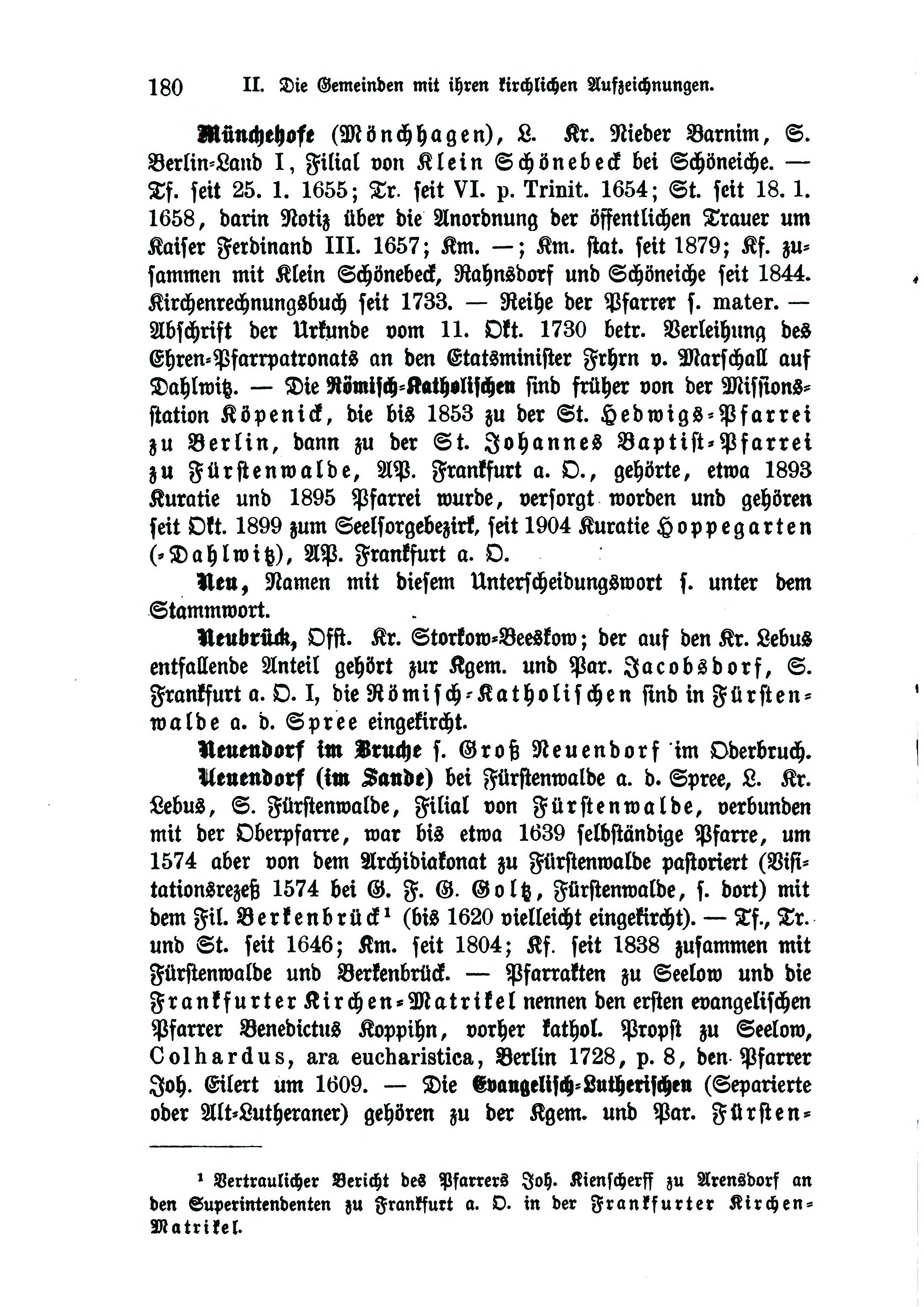 - Neuendorf (im Sande) bei Fürstenwalde a. d. Spree, L. Kr. Lebus, S. Fürstenwalde, Filial von Fürstenwalde, verbunden mit der Oberpfarre, war bis etwa 1639 selbständige Pfarre, um 1574 aber von dem Archidiakonat zu Fürstenwalde pastoriert (Visitationsrezeß 1574 bei G. F. G. Goltz, Fürstenwalde, s. dort) mit dem Berkenbrück [1] (bis 1620 vielleicht eingekircht). — Tf,, Tr. und St. seit 1646; Km. seit 1804; Kf, seit 1838 zusammen mit Fürstenwalde und Berkenbrück. — Pfarrakten zu Seelow und die Frankfurter Kirchen-Matrikel nennen den ersten evangelischen Pfarrer Benedictus Koppihn, vorher kathol. Propst zu Seelow, Colhardus, ara eucharistica, Berlin 1728, p. 8, den Pfarrer Joh. Eitert um 1609. — Die Evangelisch-Lutherischen (Separierte oder Alt-Lutheraner) gehören zu der Kgem. und Par. Fürsten-