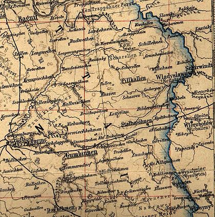 - liegt auf der linken Seite der Szeszuppe (Fluss), (auch Scheschuppe, ab 1938 Ostfluß, litauische Šešupė, russ. Шешупе) an der Landstraße von Ragnit nach Trappönen