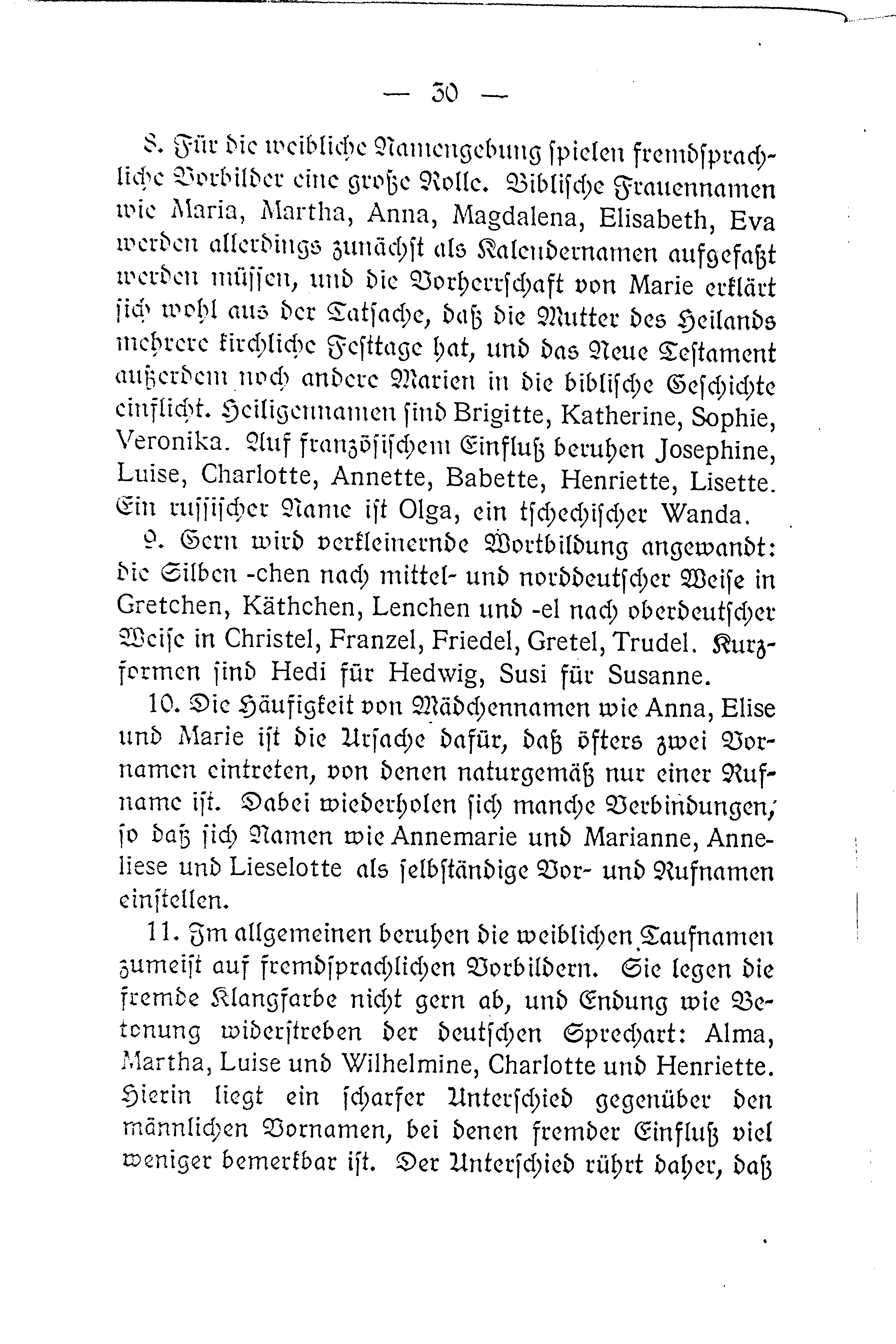 11. Im allgemeinen beruhen die weiblichen Taufnamen zumeist auf fremdsprachlichen Vorbildern. Sie legen die fremde Klangfarbe nicht gern ab, und Endung wie Betonung widerstreben der deutschen Sprechart: Alma, Martha, Luise und Wilhelmine, Charlotte und Henriette. Hierin liegt ein scharfer Unterschied gegenüber den männlichen Vornamen, bei denen fremder Einfluß viel weniger bemerkbar ist. Der Unterschied rührt daher, daß