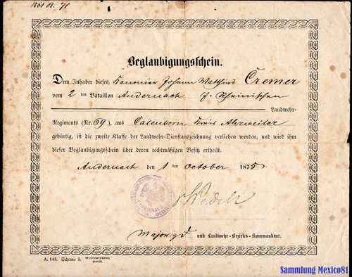 [[Datei:Beglaubigungsschein LIR 69.jpg|thumb|500 px|Beglaubigungsschein Landwehr-Dienstauszeichnung 1875]] | |||