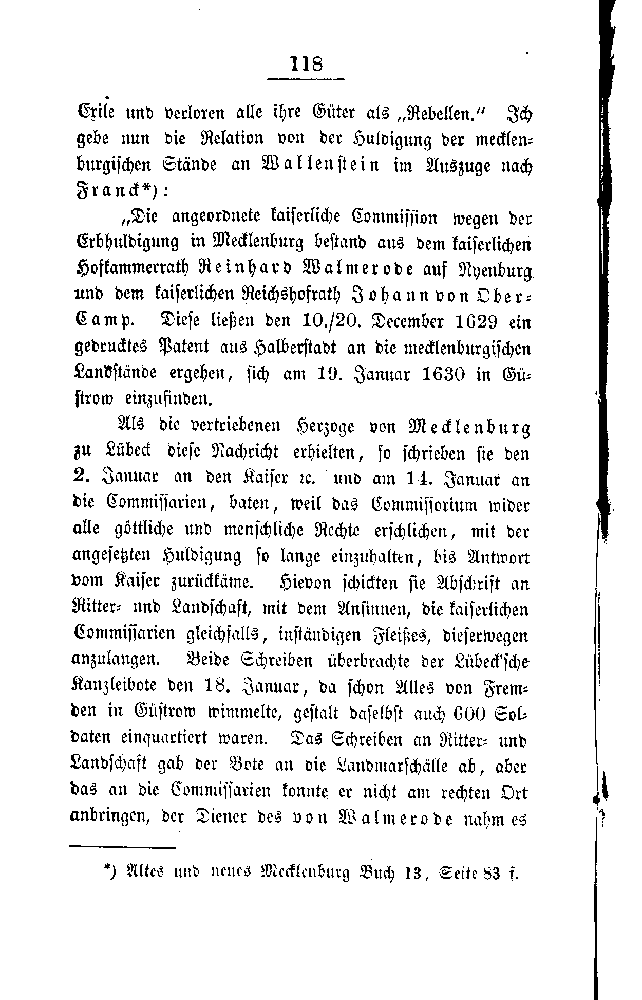 „Die angeordnete kaiserliche Commission wegen der Erbhuldigung in Mecklenburg bestand aus dem kaiserlichen Hofkammerrath {{Sperrschrift|Reinhard Walmerode}} auf Nyenburg und dem kaiserlichen Reichshofrath {{Sperrschrift|Johann von Obercamp}}. Diese ließen den 10./20. December 1629 ein gedrucktes Patent aus Halberstadt an die mecklenburgischen Landstände ergehen, sich am 19. Januar 1630 in Güstrow einzufinden. | |||