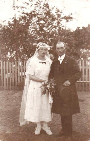 |[[Bild:Friedrich und Auguste Jonathal geb. Schulz h.jpeg|thumb|left|290px|[http://www.ortsfamilienbuecher.de/famreport.php?ofb=memelland&ID=I52377 Ernst] und [http://www.ortsfamilienbuecher.de/famreport.php?ofb=memelland&ID=I52560 Martha Lapat], geb. Jonathal (14.05.1921)]]