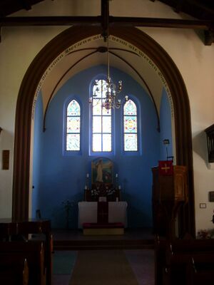 [[Bild:Ort Kirche Nidden Innenansicht 2009.JPG|thumb|left|Ansicht des Altarraumes der Niddener Kirche, 2009]] | |||