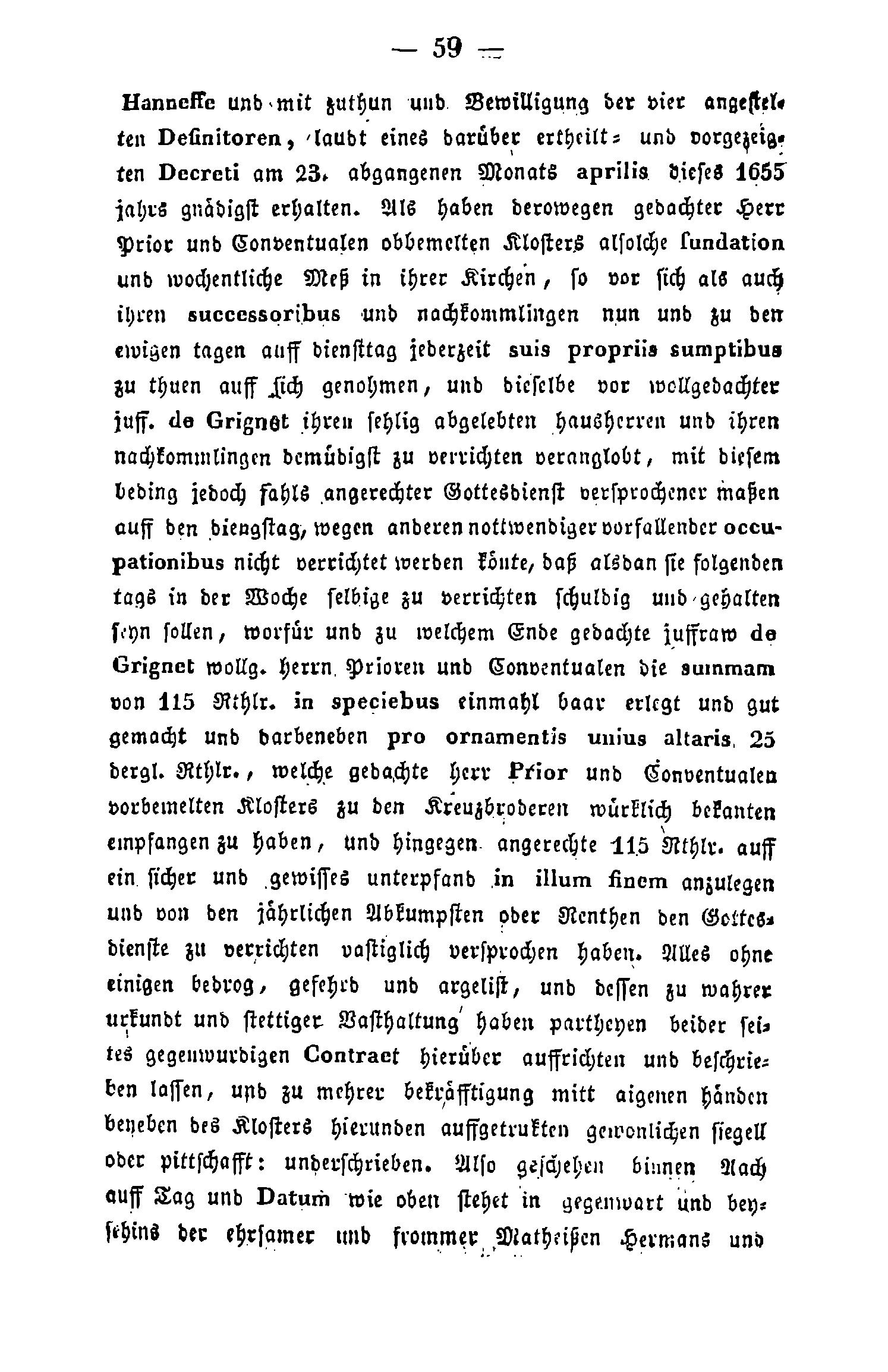 Hanneffe und mit zuthun und Bewilligung der vier angestellten Definitoren, laudt eines darüber ertheilt- und vorgezeigten Decreti am 23. abgangenen Monats aprilis dieses 1655 jahrs gnädigst erhalten. Als haben derowegen gedachter Herr Prior und Conventualen obbemelten Klosters alsolche fundation und wochentliche Meß in ihrer Kirchen, so vor sich als auch ihren successoribus und nachkommlingen nun und zu den ewigen tagen auff diensttag jederzeit suis propriis sumptibus zu thuen auff sich genohmen, und dieselbe vor wollgebachter juff. de Grignet ihren sehlig abgelebten hausherren und ihren nachkommlingen demüdtgst zu verrichten veranglobt, mit diesem beding jedoch fahls angerechter Gottesdienst versprochener maßen auff den diengstag, wegen anderen nottwendiger vorfallender occupationibus nicht verrichtet werden könte, daß alsdan sie folgenden tags in der Woche selbige zu verrichten schuldig und gehalten seyn sollen, worfür und zu welchem Ende gedachte juffraw de Grignet wollg. herrn Prioren und Conventualen die summam von 115 Rthlr. in speciebus einmahl baar erlegt und gut gemacht und darbeneben pro ornamentis unius altaris 25 dergl. Rthlr., welche gedachte herr Prior und Conventualen vorbemelten Klosters zu den Kreuzbroderen würklich bekanten empfangen zu haben, und hingegen angerechte 115 Rthlr. auff ein sicher und gewisses unterpfand in illum finem anzulegen und von den jährlichen Abkumpsten oder Renthen den Gottesdienste zu verrichten vastiglich versprochen haben. Alles ohne einigen bedrog, gefehrd und argelist, und dessen zu wahrer urkundt und stettiger Vasthaltung haben partheyen beider seites gegenwurdigen Contract hierüber auffrichten und beschrieben lassen, und zu mehrer bekräfftigung mitt aigenen händen beneben des Klosters hierunden auffgetrukten gewonlichen siegell oder pittschafft: underschrieben. Also geschehen binnen Aach auff Tag und Datum wie oben stehet in gegenwart und beysehins der ehrsamer und frommer Matheißen Hermans und