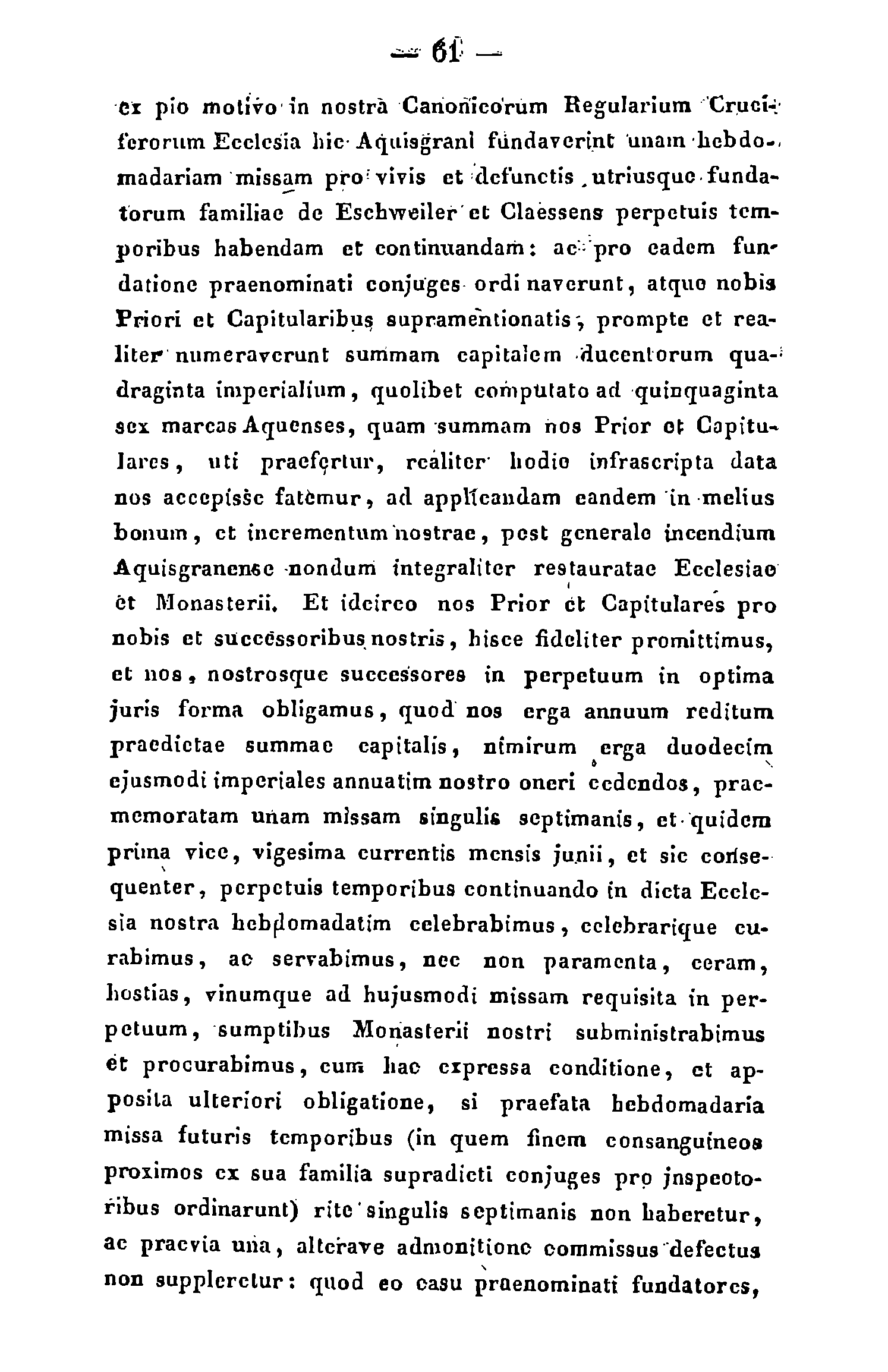 ex pio motivo in nostra Canonicorum Regularium Cruciferorum Ecclesia hic Aquisgrani fundaverint unam hebdomadariam missam pro vivis et defunctis utriusque fundatorum familiae de Eschweiler et Claessens perpetuis temporibus habendam et continuandam: ac pro eadem fundatione praenominati conjuges ordi naverunt, atque nobis Priori et Capitularibus supramentionatis, prompte et realiter numeraverunt summam capitalem ducentorum quadraginta imperialium, quolibet computato ad quinquaginta sex marcas Aquenses, quam summam nos Prior et Capitulares, uti praefertur, realiter hodie infrascripta data nos accepisse fatemur, ad applicandam eandem in melius bonum, et incrementum nostrae, post generale incendium Aquisgranense nondum integraliter restauratae Ecclesiae et Monasterii. Et idcirco nos Prior et Capitulares pro nobis et successoribus nostris, hisce fideliter promittimus, et nos, nostrosque successores in perpetuum in optima juris forma obligamus, quod nos erga annuum reditum praedictae summae capitalis, nimirum erga duodecim ejusmodi imperiales annuatim nostro oneri cedendos, praememoratam unam missam singulis septimanis, et quidem prima vice, vigesima currentis mensis junii, et sic consequenter, perpetuis temporibus continuando in dicta Ecclesia nostra hebdomadatim celebrabimus, celebrarique curabimus, ac servabimus, nec non paramenta, ceram, hostias, vinumque ad hujusmodi missam requisita in perpetuum, sumptibus Monasterii nostri subministrabimus et procurabimus, cum hac expressa conditione, et apposita ulteriori obligatione, si praefata hebdomadaria missa futuris temporibus (in quem finem consanguineos proximos ex sua familia supradicti conjuges pro jnspectoribus ordinarunt) rite singulis septimanis non haberetur, ac praevia una, alterave admonitione commissus defectus non suppleretur: quod eo casu praenominati fundatores,