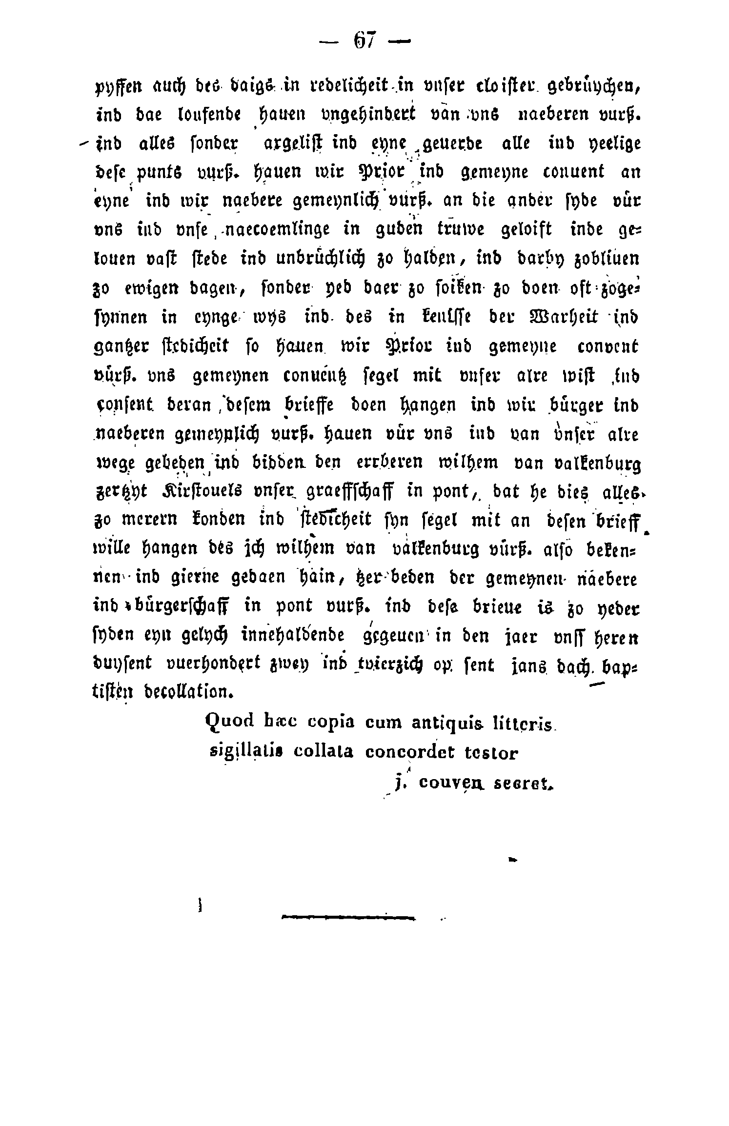pyffen auch des daigs in redelicheit in vnser cloister gebrüychen, ind dae loufende hauen vngehindert van vns naeberen vurß. ind alles sonber argelist ind eyne geuerbe alle ind yeelige dese punts vurß. hauen wir Prior ind gemeyne conuent an eyne ind wir naebere gemeynlich vurß. an die ander syde vür vns ind vnse naecoemlinge in guden truwe geloift inde gelouen vast stede ind unbrüchlich zo halden, ind darby zobliuen zo ewigen dagen, sonber yeb daer zo soiken zo doen oft zogesynnen in eynge wys ind des in kenisse der Warheit gantzer stedicheit so hauen wir Prior ind gemeyne convent vürß. vns gemeynen conuentz segel mit vnser alre wist ind consent deran desem brieffe doen hangen ind wir bürger ind naeberen gemeynlich vurß. hauen vür vns ind van unser alre wege gebeden ind bidden den errberen wilhem van valkenburg zertzyt Kirstouels vnser graeffschaff in pont, dat he dies alles zo merern konden ind stedicheit syn segel mit an desen brieff wille hangen des ich wilhem van valkenburg vürß. also bekennen ind gierne gedaen hain, tzer beden der gemeynen naebere in bürgerschaff in pont vurß. ind dese brieue is zo yeder syden eyn gelych innehaldenbe gegeuen in den jaer vnss heren duysent vuerhondert zwey ind tvierzich op sent jans dach baptisten becollation.