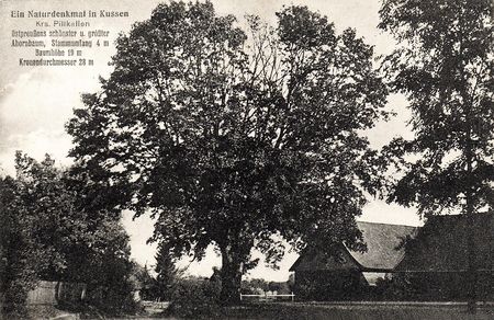 Kussen Kreis Pillkallen, Ostpreußen, galt als das Dorf mit den schönsten Bäumen in Ostpreußen. Die Kirche aus Feldsteinen 1743 gebaut hatte einen hölzernen Turm. Unweit von der Kirche stand der gewaltigste Ahornbaum der Provinz. Seine Krone hatte einen Durchmesser von 28 Meter mit einem Stammumfang von vier Meter. Nicht weit davon entfernt stand eine uralte Eiche mit einem Stammumfang von dreieinhalb Metern. Im Gutsgarten und Pfarreipark sah man hundertjährige Linden, deren stärkste einen Stammumfang von viermeterachtzig hatte.