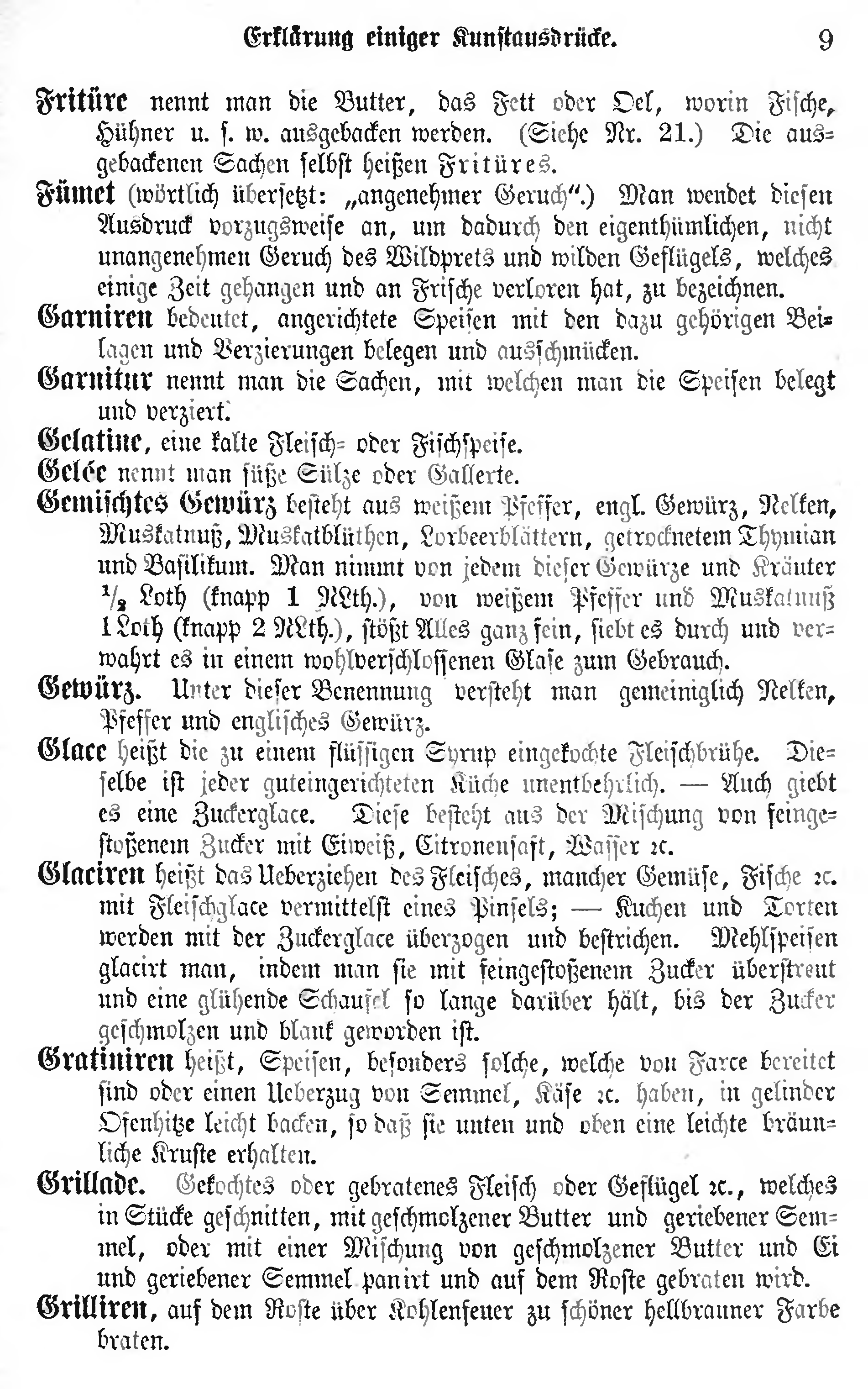 Gemischtes Gewürz besteht aus weißem Pfeffer, engl. Gewürz, Nelken, Muskatnuß, Muskatblüthen, Lorbeerblättern, getrocknetem Thymian und Basilikum. Man nimmt von jedem dieser Gewürze und Kräuter ½ Loth (knapp 1 NLht.), von weißem Pfeffer und Muskatnuß 1 Loth (knapp 2 NLth.), stößt Alles ganz fein, siebt es durch und verwahrt es in einem wohlverschlossenen Glase zum Gebrauch.