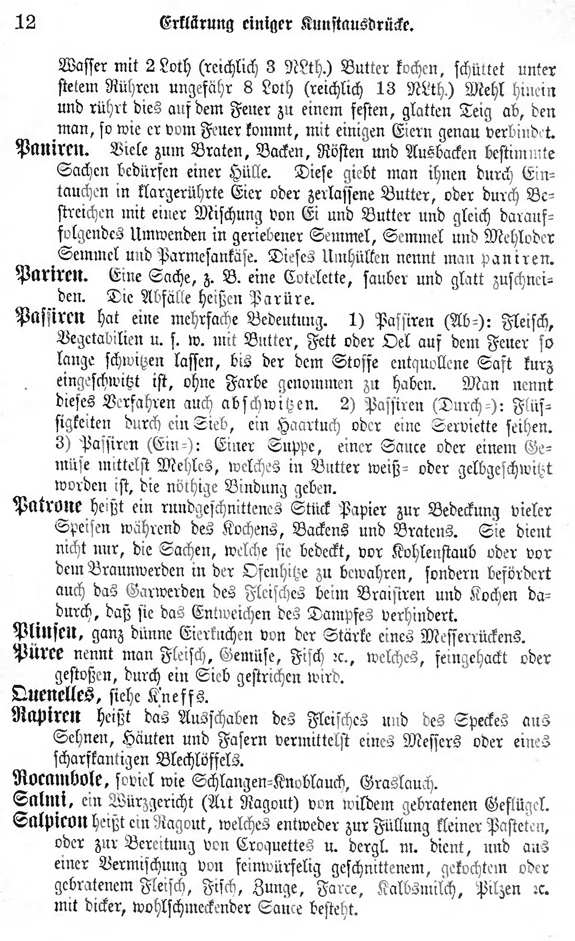 '''Paniren.''' Viele zum Braten, Backen, Rösten und Ausbacken bestimmte Sachen bedürfen einer Hülle. Diese giebt man ihnen durch Eintauchen in klargerührte Eier oder zerlassene Butter, oder durch Bestreichen mit einer Mischung von Ei und Butter und gleich darauffolgendes Umwenden in Geriebener Semmel, Semmel und Mehl oder Semmel und Parmesankäse. Dieses Umhüllen nennt man paniren. | |||
