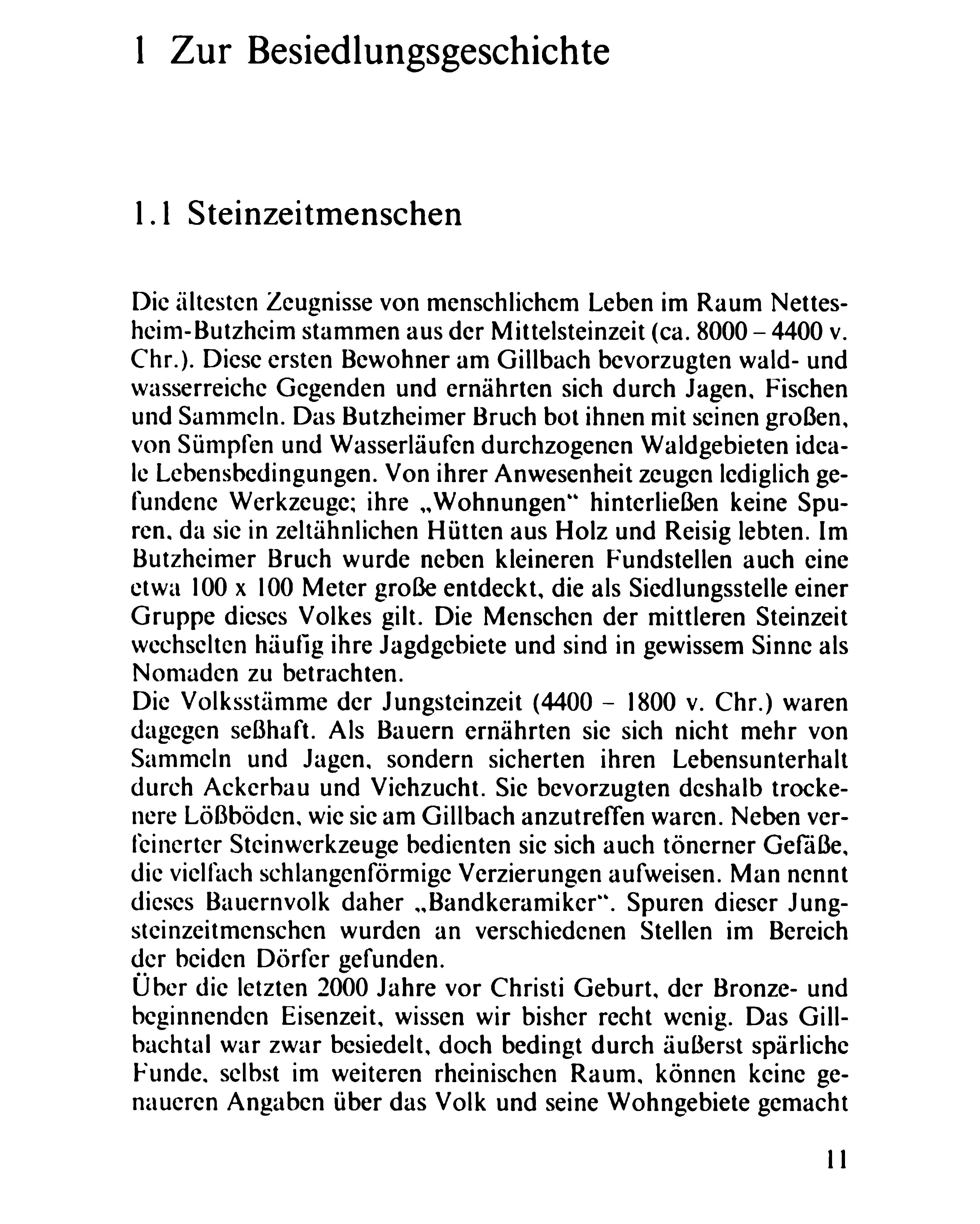 Die ältesten Zeugnisse von menschlichem Leben im Raum Nettes- heim-Butzheim stammen aus der Mittelsteinzeit (ca. 8000 — 4400 v. Chr.). Diese ersten Bewohner am Gillbach bevorzugten wald- und wasserreiche Gegenden und ernährten sich durch Jagen, Fischen und Sammeln. Das Butzheimer Bruch bot ihnen mit seinen großen, von Sümpfen und Wasserläufen durchzogenen Waldgebieten idea- le Lebensbedingungen. Von ihrer Anwesenheit zeugen lediglich ge- fundene Werkzeuge; ihre „Wohnungen" hinterließen keine Spu- ren. da sie in zeltähnlichen Hütten aus Holz und Reisig lebten. Im Butzheimer Bruch wurde neben kleineren Fundstellen auch eine etwa 100 x 100 Meter große entdeckt, die als Siedlungsstelle einer Gruppe dieses Volkes gilt. Die Menschen der mittleren Steinzeit wechselten häufig ihre Jagdgebiete und sind in gewissem Sinne als Nomaden zu betrachten. Die Volksstämme der Jungsteinzeit (4400 - 1800 v. Chr.) waren dagegen seßhaft. Als Bauern ernährten sie sich nicht mehr von Sammeln und Jagen, sondern sicherten ihren Lebensunterhalt durch Ackerbau und Viehzucht. Sie bevorzugten deshalb trocke- nere Lößböden, wie sie am Gillbach anzutreffen waren. Neben ver- feinerter Steinwerkzeuge bedienten sie sich auch tönerner Gefäße, die vielfach schlangenförmigc Verzierungen aufweisen. Man nennt dieses Bauernvolk daher „Bandkeramiker". Spuren dieser Jung- steinzeitmenschen wurden an verschiedenen Stellen im Bereich der beiden Dörfer gefunden. Über die letzten 2000 Jahre vor Christi Geburt, der Bronze- und beginnenden Eisenzeit, wissen wir bisher recht wenig. Das Gill- bachtal war zwar besiedelt, doch bedingt durch äußerst spärliche Funde. selbst im weiteren rheinischen Raum. können keine ge- naueren Angaben über das Volk und seine Wohngebiete gemacht
