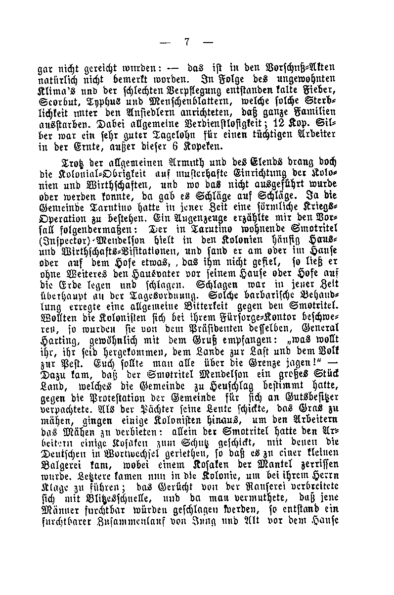 Trotz der allgemeinen Armuth und des Elends drang doch die Kolonial-Obrigkeit auf musterhafte Einrichtung der Kolonien und Wirthschaften, und wo das nicht ausgeführt wurde oder werden konnte, da gab es Schläge auf Schläge. Ja die Gemeinde Tarutino hatte in jener Zeit eine förmliche Kriegs-Operation zu bestehen. Ein Augenzeuge erzählte mir den Vorfall folgendermaßen: Der in Tarutino wohnende Smotritel (Inspector) Mendelson hielt in den Kolonien häufig Haus- und Wirthschafts-Visitationen, und fand er am oder im Hause oder auf dem Hofe etwas, das ihm nicht gefiel, so ließ er ohne Weiteres den Hausvater vor seinem Hause oder Hofe auf die Erde legen und schlagen. Schlagen war in jener Zeit überhaupt an der Tagesordnung. Solche barbarische Behandlung erregte eine allgemeine Bitterkeit gegen den Smotritel. Wollten die Kolonisten sich bei ihrem Fürsorge-Kontor beschweren, so wurden sie von denm Präsidenten desselben, General Harting, gewöhnlich mit dem Gruß empfangen: "was wollt ihr, ihr seid hergekommen, dem Lande zur Last und dem Volk zur Pest. Euch sollte man alle über die Grenze jagen !" - Dazu kam, daß der Smotritel Mendelson ein großes Stück Land, welches die Gemeinde zu Heuschlag bestimmt hatte, gegen die Protestation der Gemeinde für sich an Gutsbesitzer verpachtete. Als der Pächter seine Leute schickte, das Gras zu mähen, gingen einige Kolonisten hinaus, um den Arbeitern das Mähen zu verbieten; allein der Smotritel hatte den Arbeitern einige Kosaken zum Schutz geschickt, mit denen die Deutschen in Wortwechsel geriethen, so daß es zu einer kleinen Balgerei kam, wobei einem Kosaken der Mantel zerrissen wurde. Letztere kamen un in die Kolonie, um bei ihrem Herrn Klage zu führen; das Gerücht von der Rauferei verbreitete sich mit Blitzesschnelle, und da man vermuthete, daß jene Männer furchtbar würden geschlagen werden, so entstand ein furchtbarer Zusammenlauf von Jung und Alt vor dem Hause