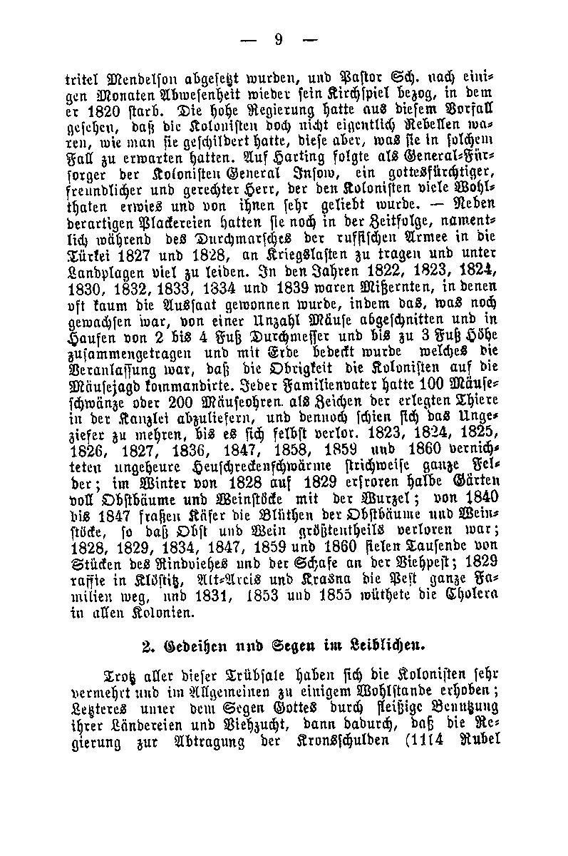 Smotritel Mendelson abgesetzt wurden, und Pastor Sch. nach einigen Monaten Abwesenheit wieder sein Kirchspiel bezog, in dem er 1820 starb. Die hohe Regierung hatte aus diesem Vorfall gesehen, daß die Kolonisten doch nicht eigentlich Rebellen waren, wie man sie geschildert hatte, diese aber, was sie in solchem Fall zu erwarten hatten. Auf Harting folgte als General-Fürsorger der Kolonisten General Insow, ein gottesfürchtiger, freundlicher und gerechter Herr, der den Kolonisten viele Wohlthaten erwies und von ihnen sehr geliebt wurde. - Neben derartigen Plackereien hatten sie noch in der Zeitfolge, namentlich während des Durchmarsches der russischen Armee in die Türkei 1827 und 1828, an Kriegslasten zu tragen und unter Landplagen viel zu leiden. In den Jahren 1822, 1823, 1824, 1830, 1832, 1833, 1834 und 1839 waren Mißernten, in denen oft kaum die Aussaat gewonnen wurde, indem da, was noch gewachsen war, von einer Unzahl Mäuse abgeschnitten und in Haufen von 2 bis 4 Fuß Durchmesser und bis zu 3 Fuß Höhe zusammengetragen und mit Erde bedeckt wurde welches die Veranlassung war, daß die Obrigkeit die Kolonisten auf die Mäusejagd kommandirte. Jeder Familienvater hatte 100 Mäuseschwänze oder 200 Mäuseohren als Zeichen der erlegten Thiere in der Kanzlei abzuliefern, und dennoch schien sich das Ungeziefer zu mehren, bis es sich selbst verlor. 1823, 1824, 1825, 1826, 1827, 1836, 1847, 1858, 1859 und 1860 vernichteten ungeheure Heuschreckenschwärme strichweise ganze Felder; im Winter von 1828 auf 1829 erfroren halbe Gärten voll Obstbäume und Weinstöcke mir der Wurzel; von 1840 bis 1847 fraßen Käfer die Blüthen der Obstbäume und Weinstöcke, so daß Obst und Wein größtentheils verloren war; 1828, 1829, 1834, 1847, 1859 und 1860 fielen Tausende von Stücken des Rindviehes und der Schafe an der Viehpest; 1829 raffte in Klöstitz, Alt-Arcis und Krasna die Pest ganze Familien weg, und 1831, 1853 und 1855 wüthete die Cholera in allen Kolonien.