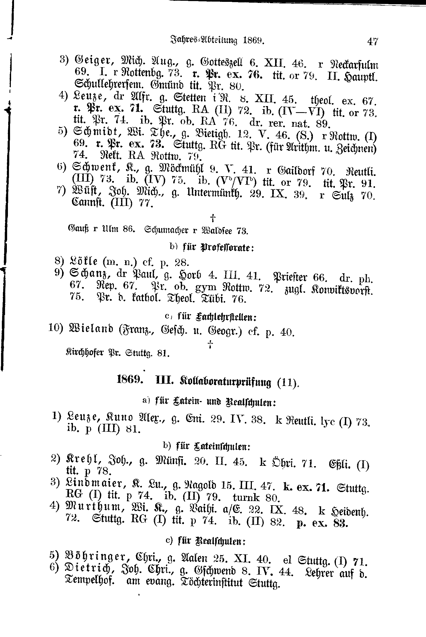 - Geiger, Mich. Aug., g. Gotteszell 6. XII. 46. r Neckarsulm 69. I. r Rottenbg. 73. r. Pr. ex. 76. tit. or 79. II. Hauptl. Schullehrersem. Gmünd tit. Pr. 80.