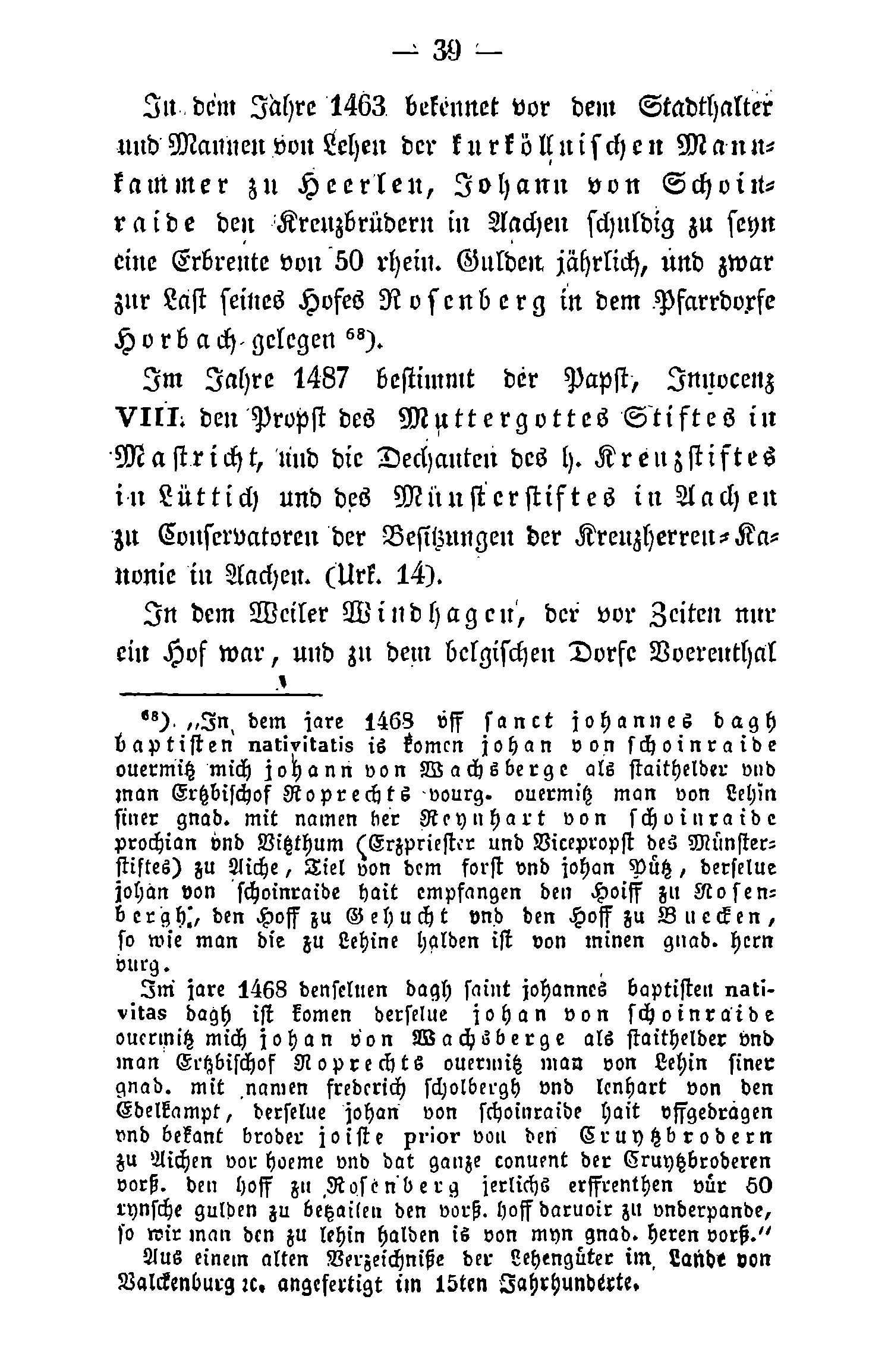 Im jare 1468 denseluen dagh saint johannes baptisten nativitas dagh ist komen derselue johan von schoinraide ouermitz mich johan von Wachsberge als staithelder vnd man Ertzbischof Roprechts ouermitz man von Lehin siner gnad. mit namen frederich scholbergh vnd lenhart von den Edelkampt, derselue johan von schoinraide hait vffgedragen vnb bekant brober joiste prior von den Cruytzbrodern zu Aichen vor hoeme vnd dat ganze conuent der Cruytzbroderen vorß. den hoff zu Rosenberg jerlichs erffrenthen vür 50 rynsche gulten zu betzailen den vorß. hoff daruoir zu vnderpande, so wir man den zu lehin halden is von myn gnad. heren vorß.“