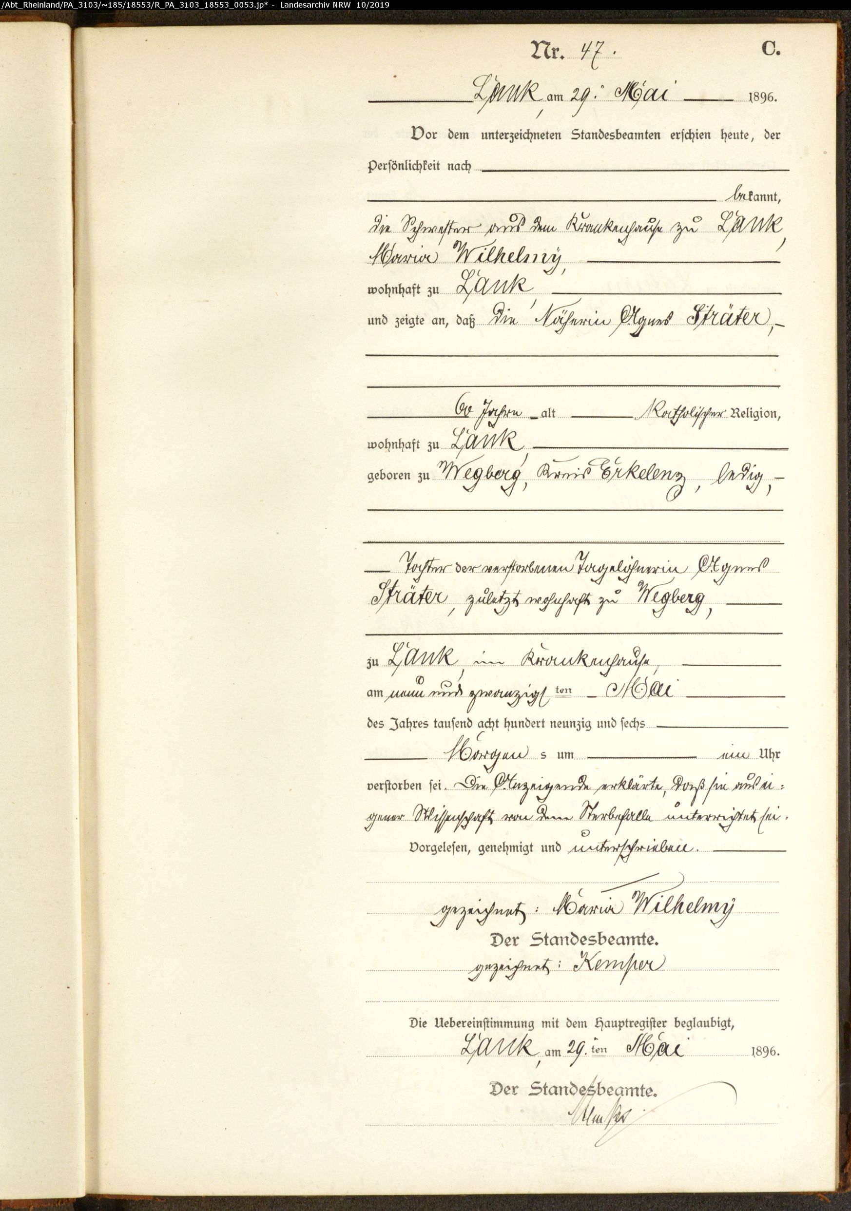 - Sträter, Agnes + 29. Mai 1896 im Krankenhause zu Lank (Heute Meerbusch), Sterberegister 47/1896 Standesamt Lank, * in Wegberg, 60 Jahre alt, ledig, Näherin, Mutter Agnes Sträter, verst. zu Wachtendonk [1]