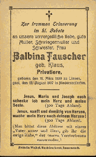 | 06:33, 11. Mai 2005 | Totenzettel Ablassgebet Fauscher.png (Datei) | 17 KB | Totenzettel mit einem Ablassgebet | 1 | |