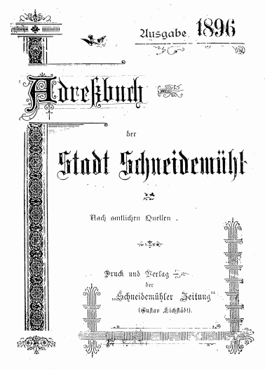 | 11:03, 26. Nov. 2005 | Adressbuch Schneidemuehl 1896 Titelblatt.png (Datei) | 26 KB | Titelblatt des Adressbuches Schneidemuehl von 1896 | 1 | |