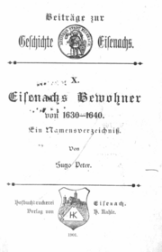 | 10:14, 11. Dez. 2005 | Adressbuch Eisenach 1630-1640 Deckblatt.png (Datei) | 24 KB | Titelblatt des Einwohnerverzeichnisses Eisenach von 1630-1640 | 1 | |