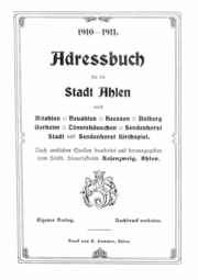 | 21:56, 10. Okt. 2005 | Ahlen Adressbuch 1910-1911 Deckblatt.png (Datei) | 21 KB | Deckblatt des Adressbuches Ahlen von 1910-1911 | 1 | |