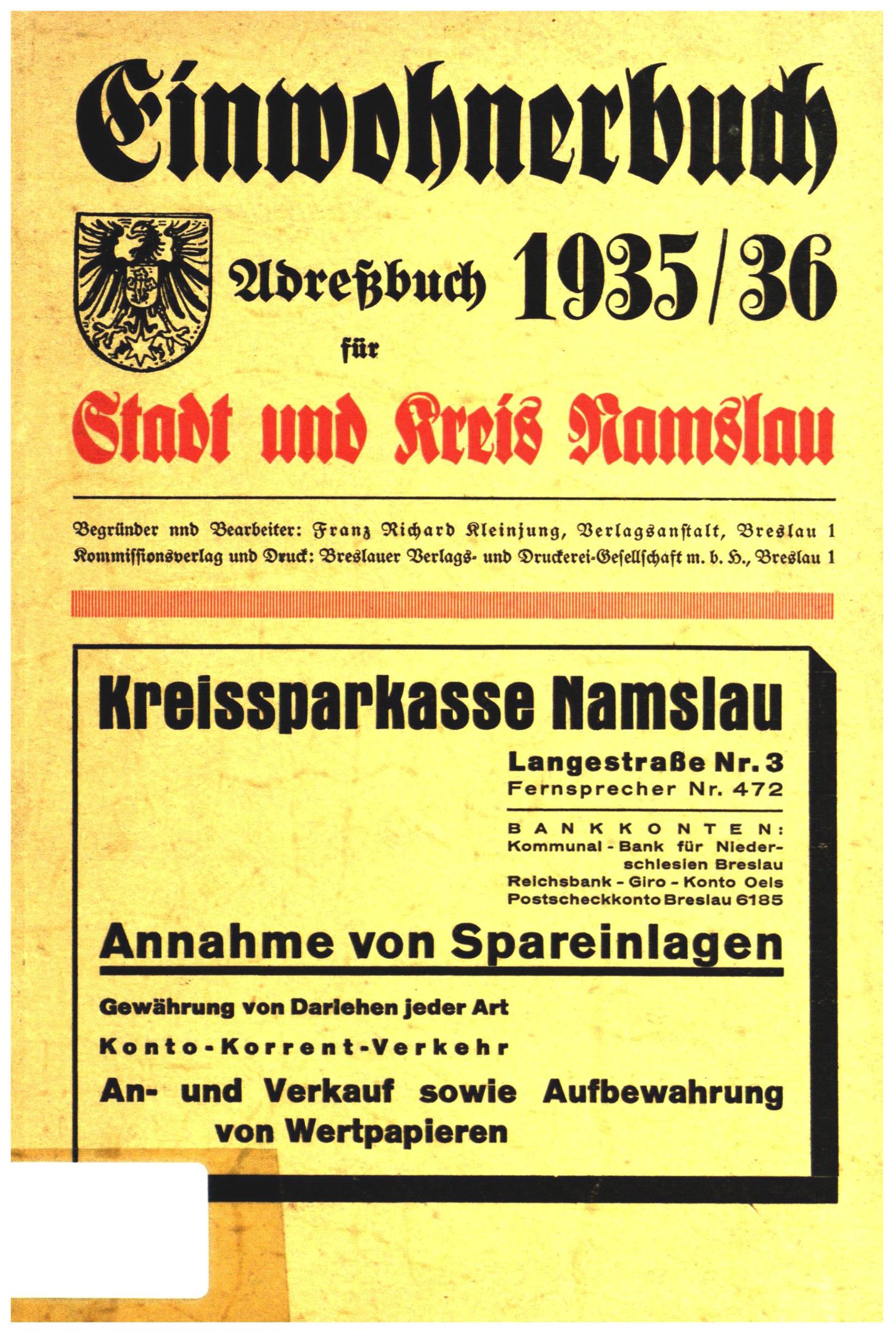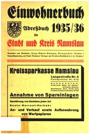 | 10:47, 5. Jul. 2021 | Cover Namslau 1935.jpg (Datei) | 475 KB | {{Information |Beschreibung = Cover - Adreßbuch / Einwohnerbuch der Stadt und des Kreises Namslau 1935/1936 |Quelle = Martin-Opitz-Bibliothek |Urheber = |Datum = |Scans = |Genehmigung = |Andere_Versionen = |Anmerkungen = }} [[Category:Images | 1 | |