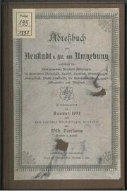 | 09:19, 18. Jun. 2021 | Cover Neustadt Wstr 1891.jpg (Datei) | 368 KB | {{Information |Beschreibung = Cover - Adreßbuch Neustadt a. d. Haardt und Umgebung 1891 |Quelle = [http://wiki-de.genealogy.net/Dilibri_Rheinland-Pfalz Dilibri] |Urheber = [http://wiki-de.genealogy.net/Dilibri_Rheinland-Pfalz ) |Datum = |Scans = |Gene | 1 | |