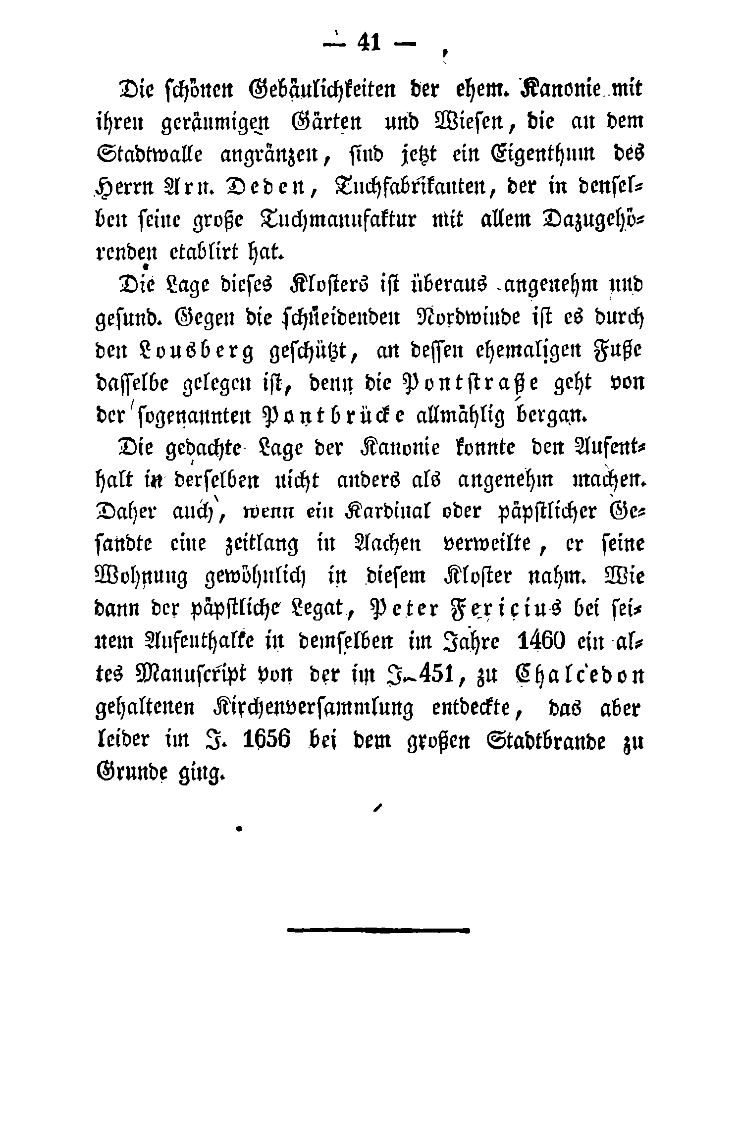 Die gedachte Lage der Kanonie konnte den Aufenthalt in derselben nicht anders als angenehm machen. Daher auch, wenn ein Kardinal oder päpstlicher Gesandte eine zeitlaug in Aachen verweilte, er seine Wohnung gewöhnlich in diesem Kloster nahm. Wie dann der päpstliche Legat, Peter Fericius bei seinem Aufenthalte in demselben im Jahre 1460 ein altes Manuscript von der im J. 451, zu Chalcedon gehaltenen Kirchenversammlung entdeckte, das aber leider im J. 1656 bei dem großen Stadtbrande zu Grunde ging.