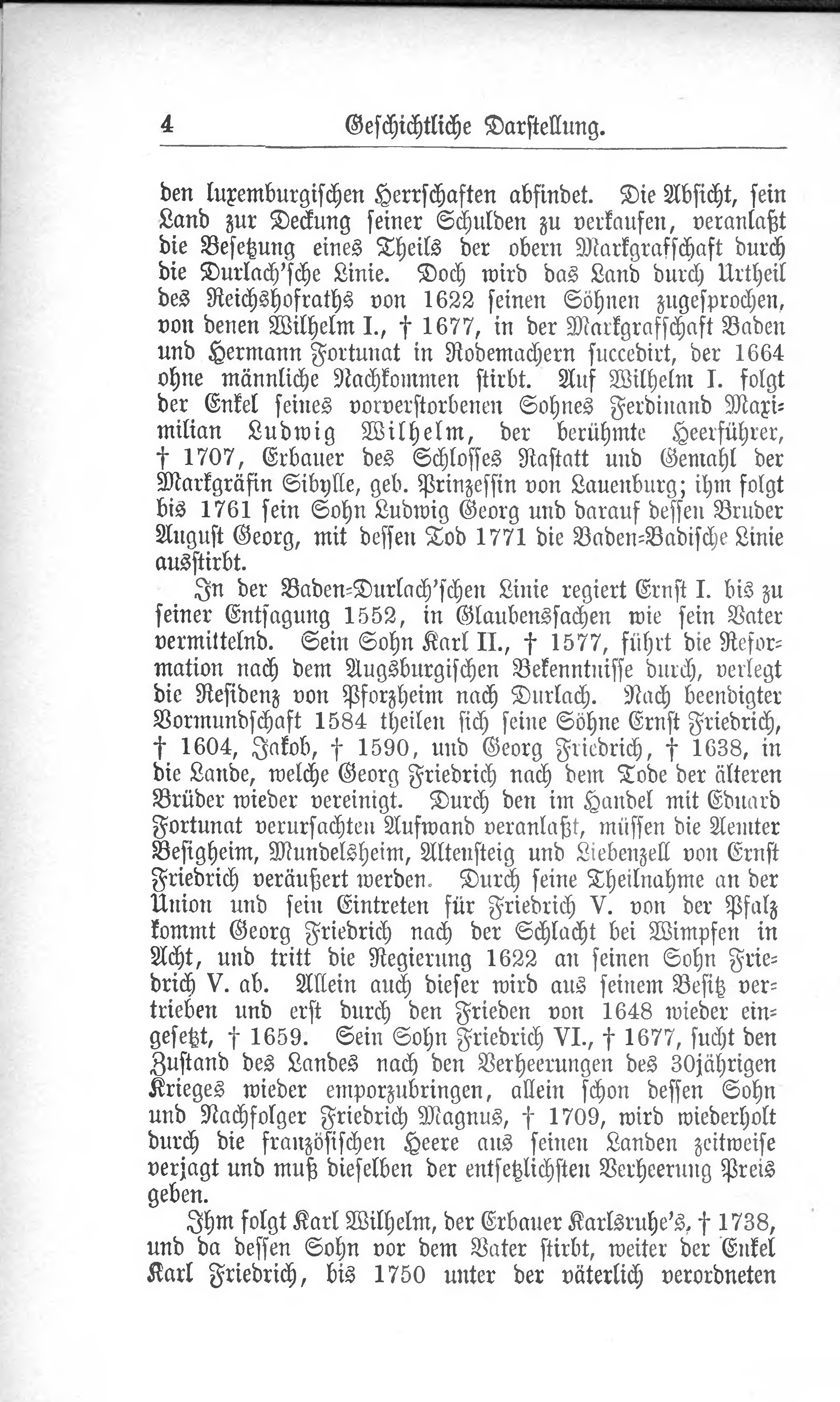 den luxemburgischen Herrschaften abfindet. Die Absicht, sein Land zur Deckung seiner Schulden zu verkaufen, veranlaßt die Besetzung eines Theils der oberen Markgrafschaft durch die Durlach'sche Linie. Doch wird das Land durch Urtheil des Reichshofrathes von 1622 seinen Söhnen zugesprochen, von denen Wilhelm I., † 1677, in der Markgrafschaft Baden und Hermann Fortunat in Rodemachern succedirt, der 1664 ohne männliche Nachkommen stirbt. Auf Wilhelm I. folgt der Enkel seines vorverstorbenen Sohnes Ferdinand Maximilian Ludwig Wilhelm, der berühmte Heerführer, † 1707, Erbauer des Schlosses Rastatt und Gemahl der Markgräfin Sibylle, geb. Prinzessin von Lauenburg; ihm folgt bis 1761 sein Sohn Ludwig Georg und darauf dessen Bruder August Georg, mit dessen Tod 1771 die Baden-Badische Linie ausstirbt.