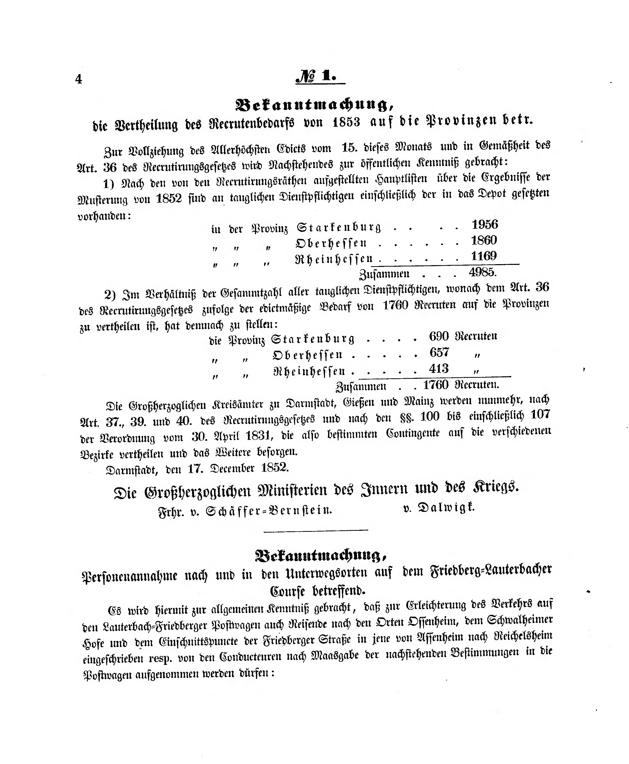 Die Großherzoglichen Kreisämter zu Darmstadt, Gießen und Mainz werden nunmehr, nach Art. 37., 39. und 40. des Recrutirungsgesetzes und nach den §§. 100 bis einschließlich 107der Verordnung vom 30. April 1831, die also bestimmten Contingente auf die verschiedenen Bezirke vertheilen und das Weitere besorgen. Darmstadt, den 17. December 1852.