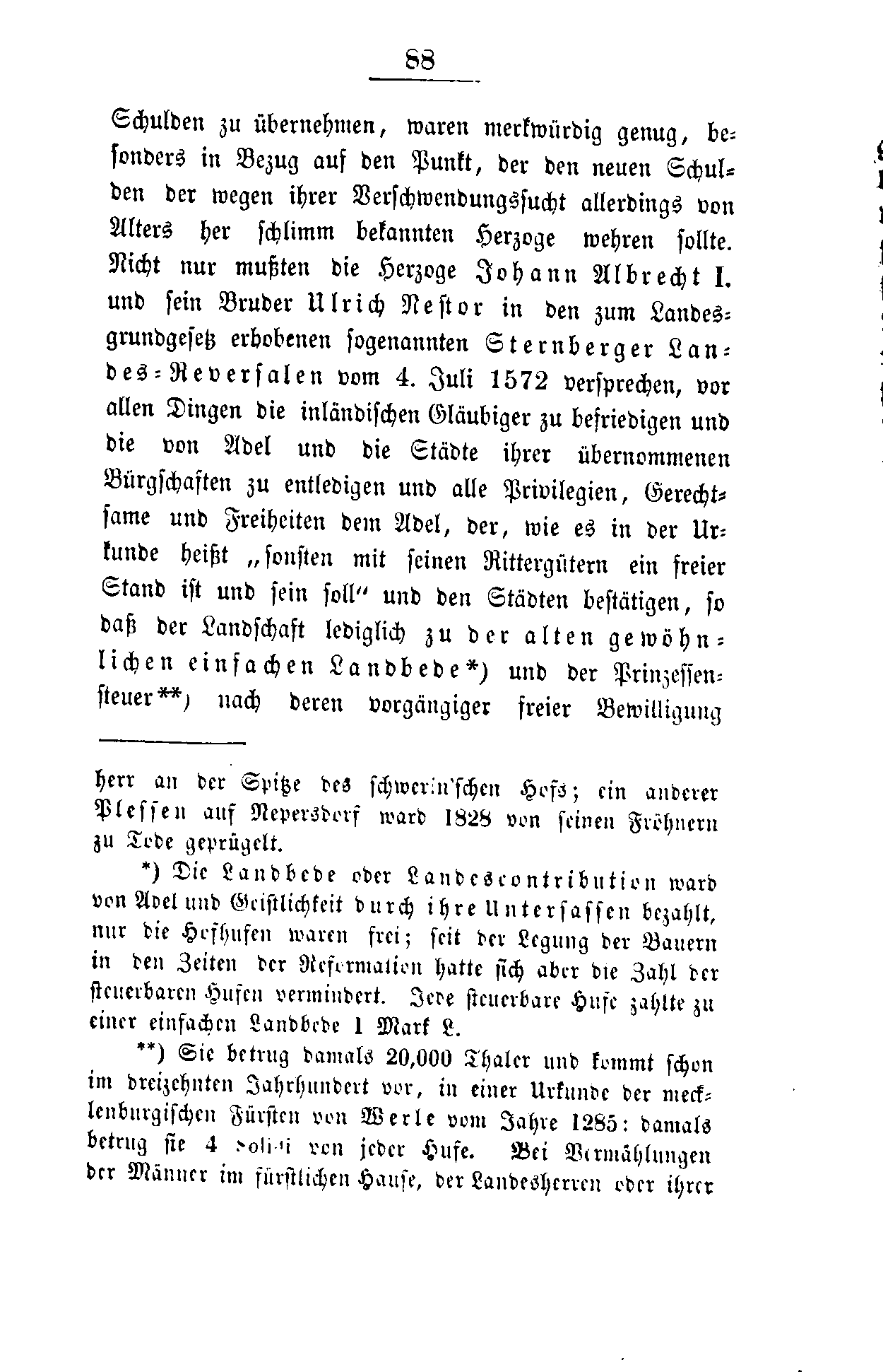 Schulden zu übernehmen, waren merkwürdig genug, besonders in Bezug auf den Punkt, der den neuen Schulden der wegen ihrer Verschwendungssucht allerdings von Alters her schlimm bekannten herzoge werden sollte. Nicht nur mußten die Herzoge Johann Albrecht I. und sein Bruder Ulrich Nestor in den zum Landesgrundgesetz gerhobenen sogenannten Sternberger Landes-Reversalen vom 4. Juli 1572 verprechen, vor allen Dingen die inländischen Gläubiger zu befriedigen und die von Adel und die Städte ihrer übernommenen Bürgschaften zu entledigen und alle Privilegien, Gerechtsame und Freiheiten dem Adel, der, wie es in der Urkunde heißt„sonsten mit seinen Rittergütern ein freier Stand ist und sein soll“ und den Städten bestätigen, so daß der Landschaft lediglich zu der alten gewöhnlichen einfachen Landbede[1] und der Prinzessensteuer[2] nach deren vorgängiger freier Bewilligung