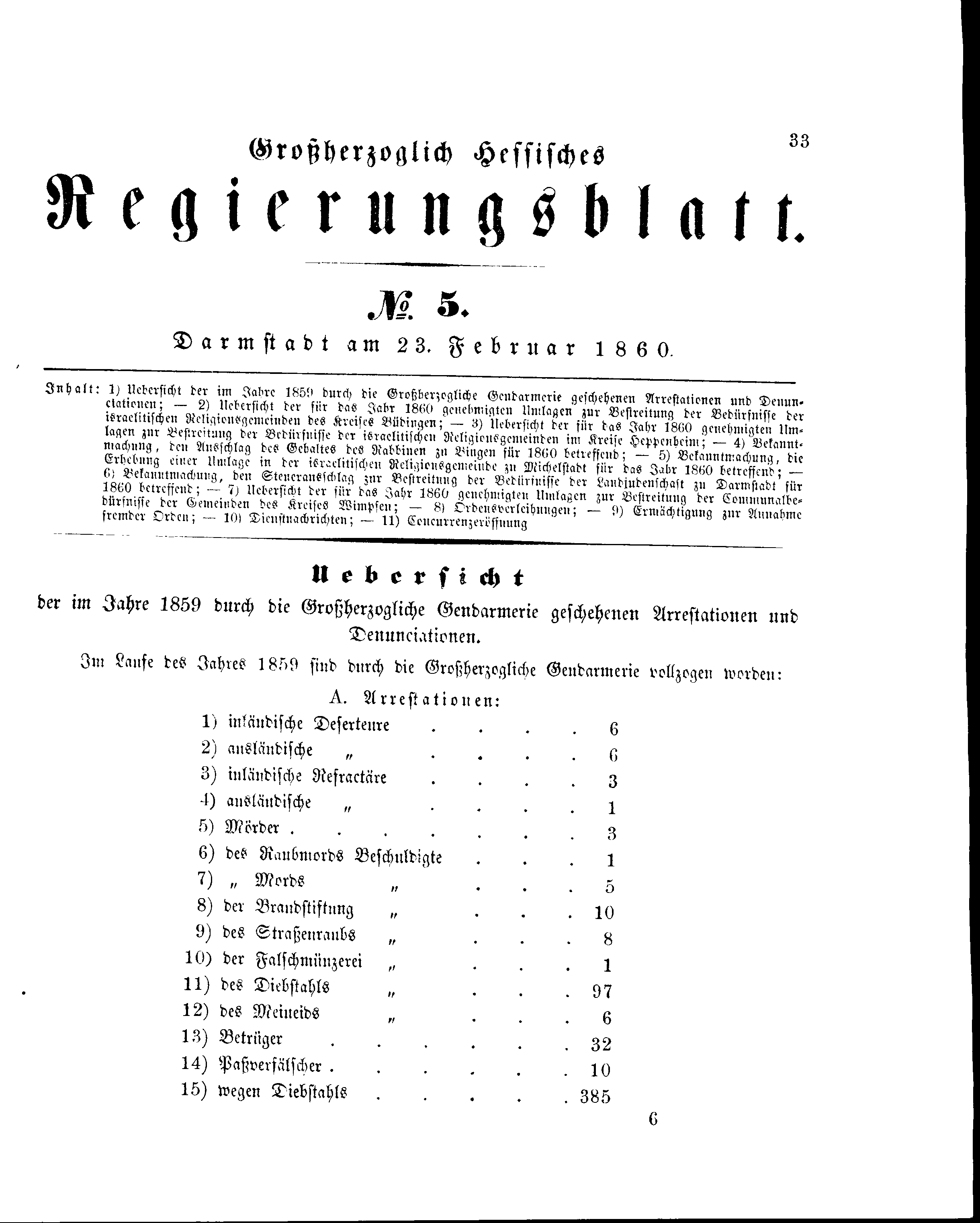 Inhalt: 1) Uebersicht der im Jahre 1859 durch die Großherzogliche Gendarmerie geschehenen Arrestationen und Denunciationen; - 2) Uebersicht der für das Jahr 1860 genehmigten Umlagen zur Bestreitung der Bedürfnisse der israelitischen Religionsgemeinden des Kreises Büdingen; - 3) Uebersicht der für das Jahr 1860 genehmigten Umlagen zur Bestreitung der Bedürfnisse der israelitischen Religionsgemeinden im Kreise Heppenheim; - 4) Bekanntmachung, den Ausschlag des Gehaltes des Rabbinen zu Bingen für 1860 betreffend; - 5) Bekanntmachung, die Erhebung einer Umlage in der israelitischen Religionsgemeinde zu Michelstadt für das Jahr 1860 betreffend; - 6) Bekanntmachung, den Steuerausschlag zur Bestreitung der Bedürfnisse der Landjudenschaft zu Darmstadt für 1860 betreffend; - 7) Uebersicht der für das Jahr 1860 genehmigten Umlagen zur Bestreitung der Communalbedürfnisse der Gemeinden des Kreises Wimpfen; - 8) Ordensverleihungen; - 9) Ermächtigung zur Annahme fremder Orden; - 10) Dienstnachrichten; - 11) Concurrenzeröffnung.